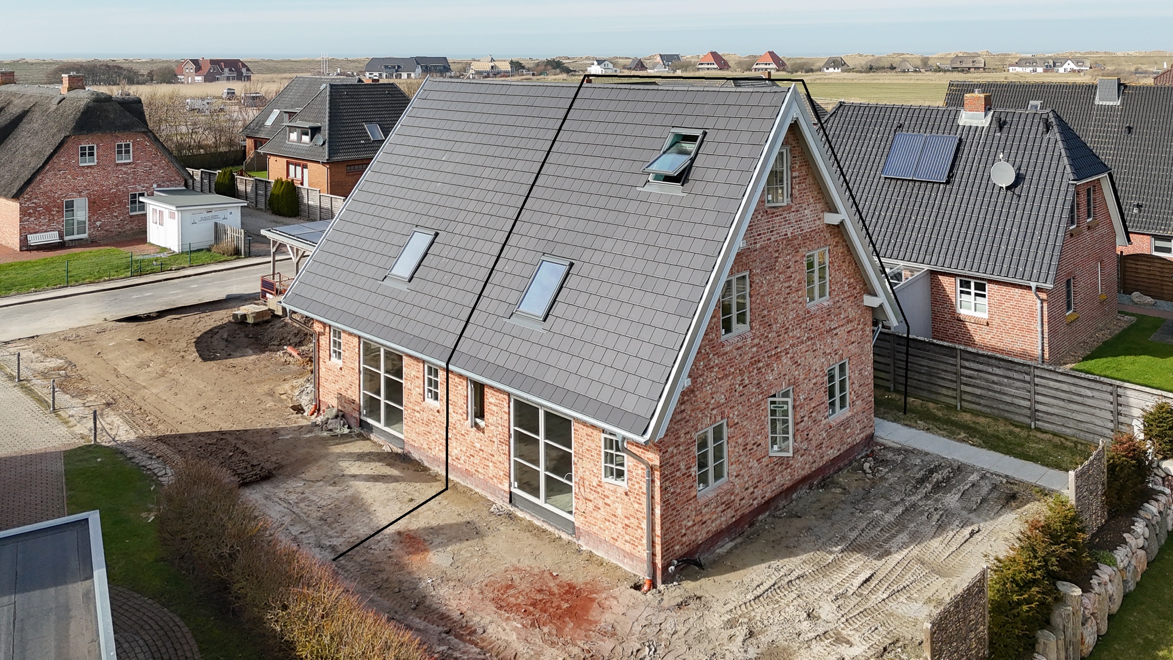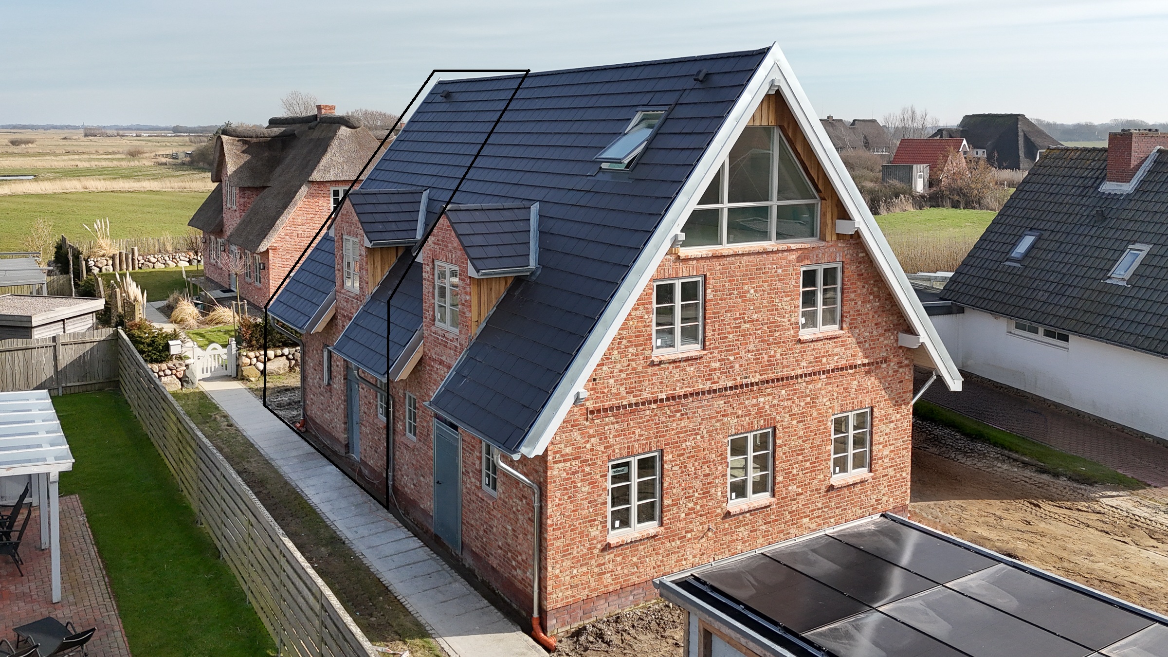 Das Haus steht auf einem ca. 501 m² großen Grundstück und bietet eine Wohnfläche von rund ca. 88 m². Die Architektur spiegelt die ortstypische Bauweise wider und wird durch einen charakteristischen Antikverblender geprägt, der dem Objekt eine besondere, hochwertige Ausstrahlung verleiht und sich harmonisch in die nordfriesische Umgebung einfügt. Im Erdgeschoss erwartet Sie ein durchdachtes Raumkonzept. Herzstück bildet der offene Wohn- und Essbereich mit integrierter Küchennische, der durch seine Helligkeit und Großzügigkeit überzeugt. Von hier aus schließt sich direkt die Terrasse an, wodurch eine fließende Erweiterung des Wohnraums nach draußen entsteht und ein harmonisches Zusammenspiel von Innen- und Außenbereich ermöglicht wird. Ergänzt wird diese Ebene durch ein Gäste-WC sowie einen Hauswirtschaftsraum mit moderner Erdwärmepumpe mit Tiefenbohrung, die für eine nachhaltige und effiziente Energieversorgung sorgt. Eine Fußbodenheizung gewährleistet dabei im gesamten Haus ein angenehmes Wohnklima. Das Obergeschoss beherbergt zwei gut geschnittene Schlafzimmer sowie ein großzügiges Badezimmer, das mit einer Eckbadewanne, einer bodenebenen Dusche, integrierter Sauna sowie hochwertigen Axor Armaturen von Hansgrohe in Schwarz matt ausgestattet ist – ein besonderer Rückzugsort für entspannte Stunden. Zusätzlichen Stauraum sowie weitere Nutzungsmöglichkeiten bietet der Spitzboden, der flexibel gestaltet werden kann. Ein eigener Stellplatz rundet das Angebot ab. Der Außenbereich überzeugt durch einen angelegten Garten mit Terrasse aus hochwertigen Krustenplatten, die sich stimmig in die natürliche Umgebung einfügen.