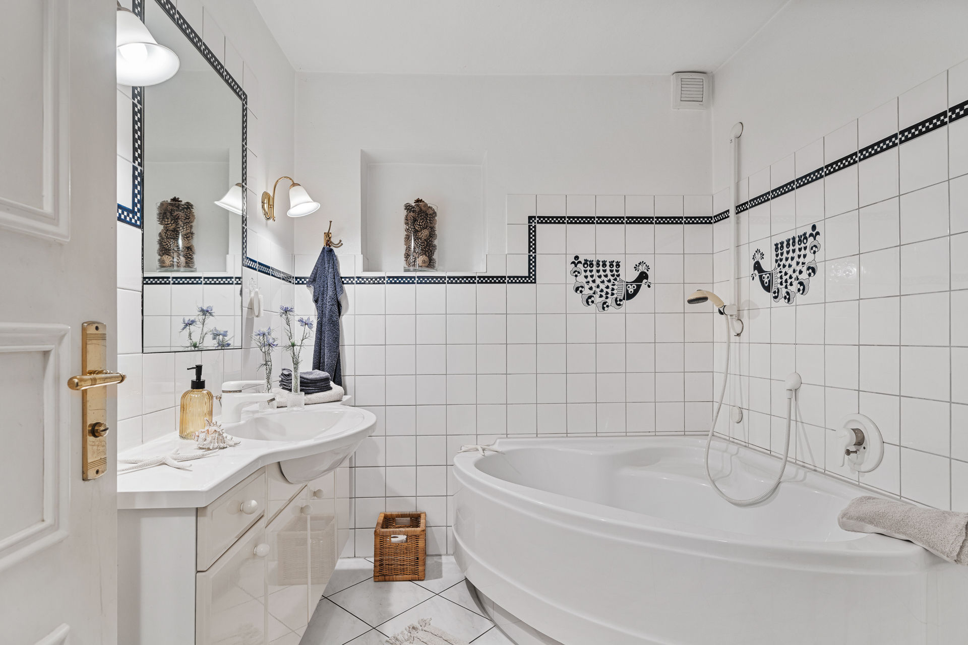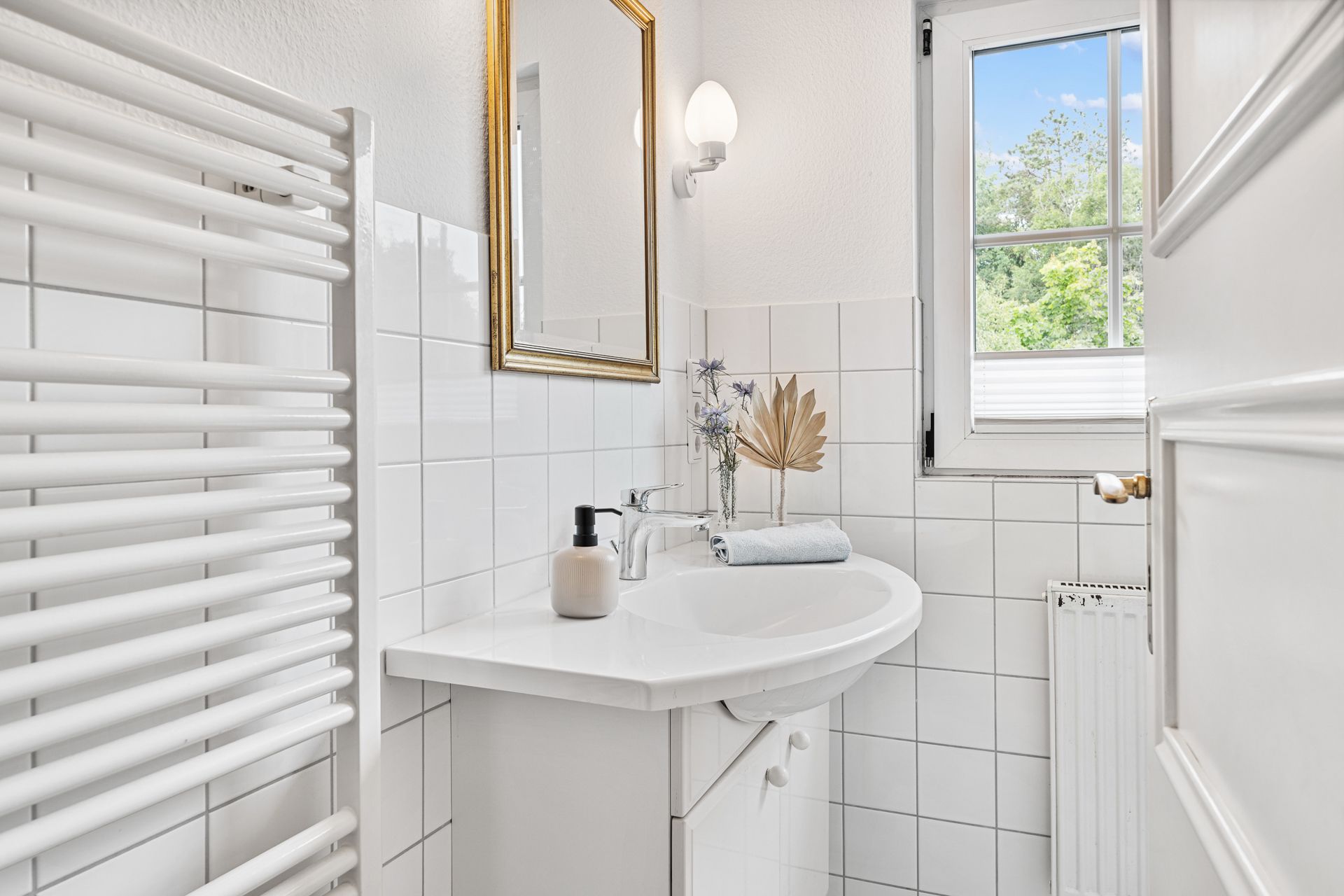 Zur linken Seite des Eingangsbereichs führt eine Holzschiebetür mit Glaselementen in die helle Küche samt gemütlicher Sitzecke. Ebenfalls im Erdgeschoss befinden sich ein Badezimmer mit großer Eckbadewanne sowie ein weiterer Raum, der aktuell als Saunabereich genutzt wird. Eine offene Holztreppe führt ins Obergeschoss. Dort bieten drei Schlafzimmer und ein zusätzliches kleines Badezimmer vielseitige Nutzungsmöglichkeiten - für Familien, Gäste oder ein separates Homeoffice.