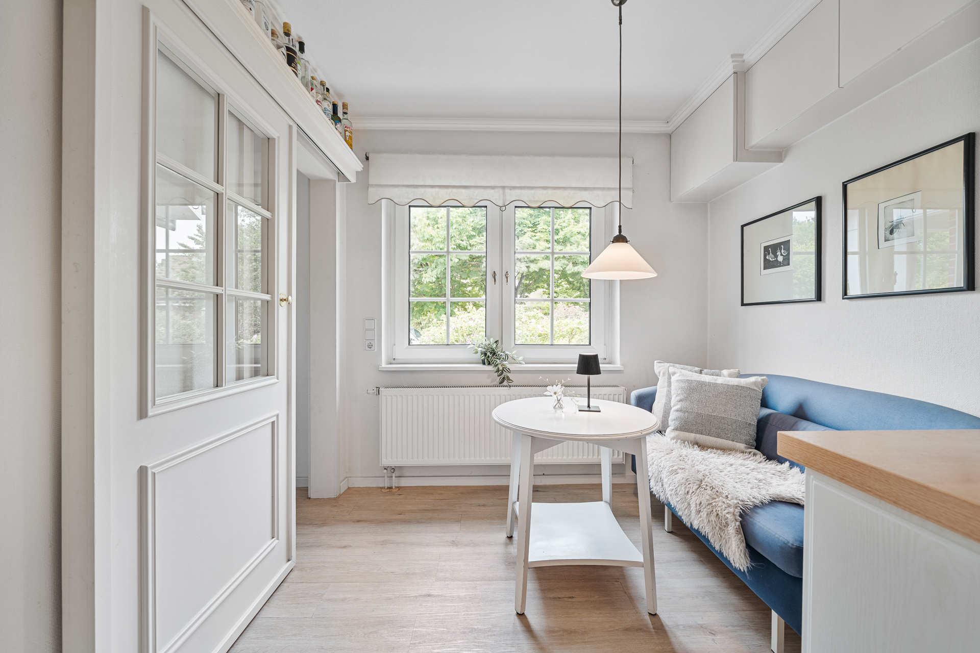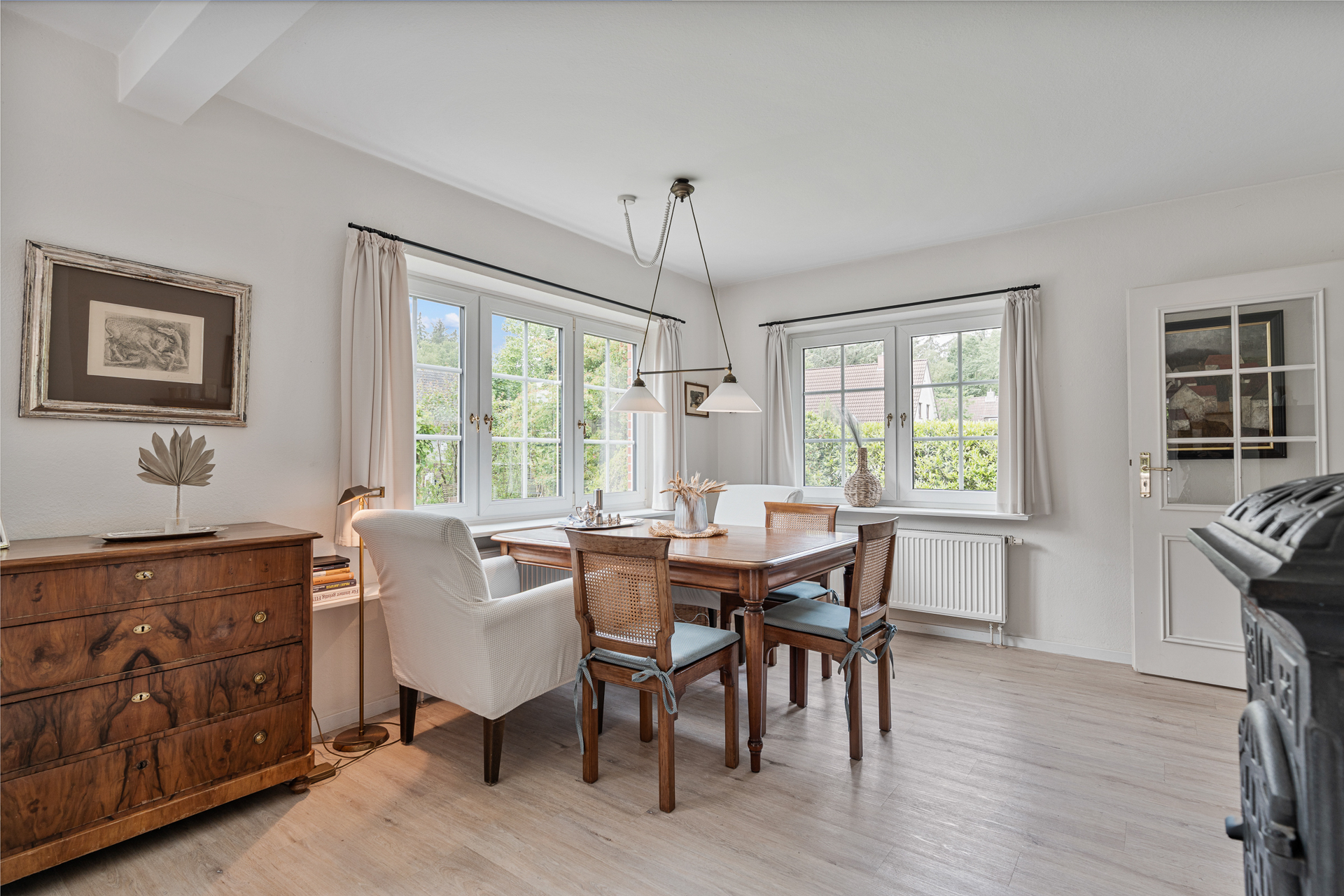 Einladend betreten Sie das Haus über eine kleine, überdachte Veranda. Der Flur öffnet sich rechts zum stilvollen Wohn- und Essbereich mit direktem Zugang zur großen, überdachten Gartenveranda - ein lichtdurchfluteter Lieblingsplatz, der zu jeder Tages- und Jahreszeit nutzbar ist. Die großzügige Fensterfront verbindet Innen- und Außenraum auf harmonische Weise.