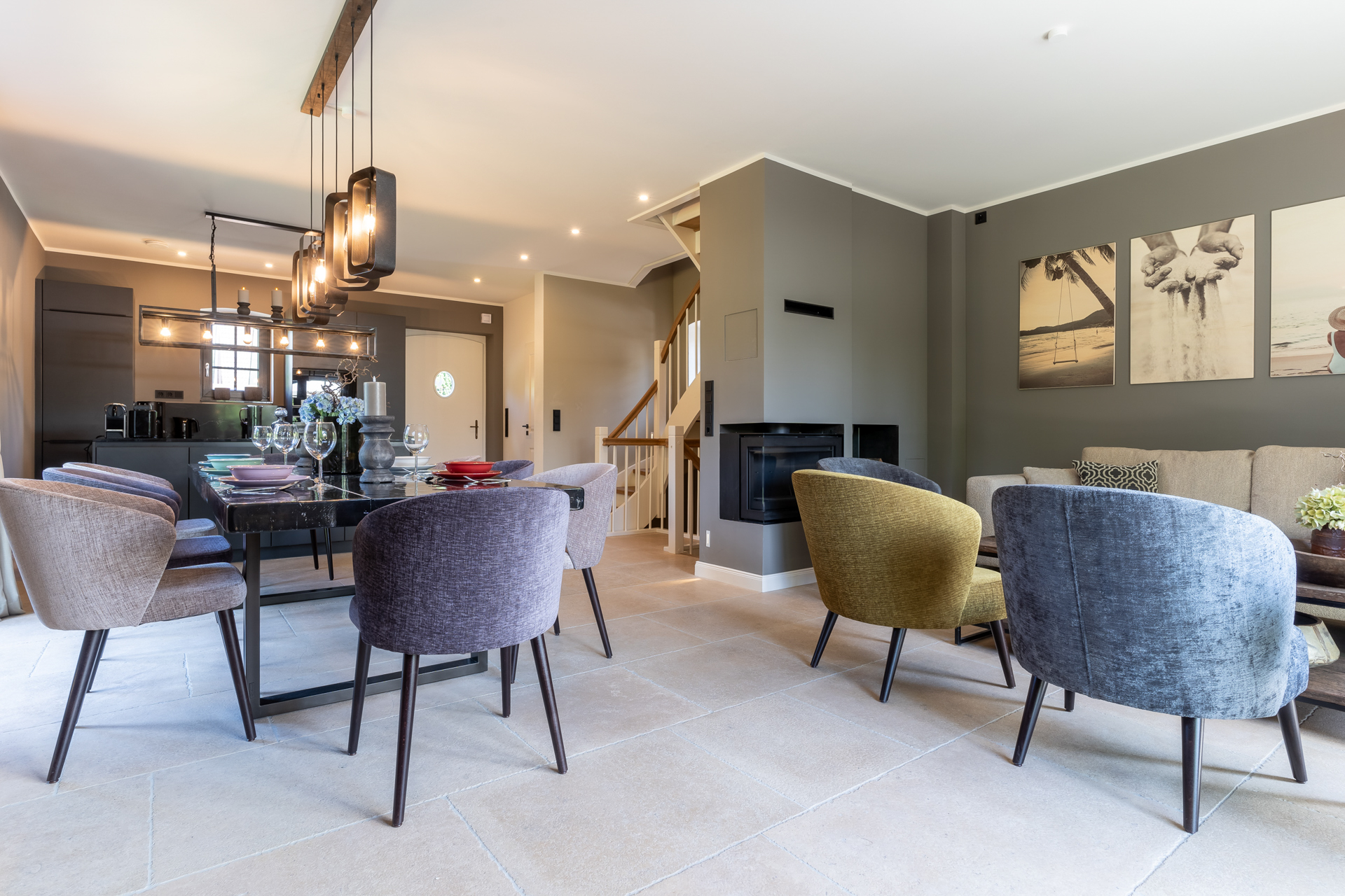 Dieses außergewöhnlich stilvolle Einfamilienhaus vereint moderne Architektur, hochwertige Ausstattung und ein durchdachtes Raumkonzept in begehrter Lage zwischen den Ortsteilen Dorf und Böhl in St. Peter-Ording. Auf rund 156 m² Wohnfläche erwartet Sie ein Zuhause, das sowohl optisch als auch funktional höchsten Ansprüchen gerecht wird. Bereits beim Betreten wird die besondere Wohnqualität spürbar. Helle Räume, großzügige Fensterflächen und eine klare, moderne Gestaltung schaffen eine offene und einladende Atmosphäre. Der großzügige Wohn- und Essbereich überzeugt mit stilvollem Interieur, eleganten Lichtkonzepten und einem integrierten Kamin, der dem Raum eine warme und gemütliche Note verleiht. Die hochwertige Designküche mit großzügiger Kochinsel fügt sich harmonisch in den Wohnbereich ein und beeindruckt mit edlen Oberflächen, klaren Linien und moderner Ausstattung. Sie bietet ideale Voraussetzungen für geselliges Kochen und Genießen. Im Obergeschoss erwarten Sie geschmackvoll eingerichtete Schlafzimmer mit viel Tageslicht, ruhiger Ausstrahlung und durchdachten Einbauten. Die Kombination aus hochwertigen Materialien, warmen Holzböden und stilvollen Details schafft eine angenehme Wohlfühlatmosphäre. Ein besonderes Highlight bildet der exklusive Wellnessbereich im Kellergeschoss. Hier treffen moderne Saunaarchitektur, eine freistehende Badewanne und ein hochwertig ausgestattetes Badezimmer aufeinander und schaffen eine private Spa Oase im eigenen Zuhause. Auch die Bäder im Haus überzeugen durch ihr modernes Design mit großformatigen Fliesen, eleganten Armaturen und klarer Linienführung.