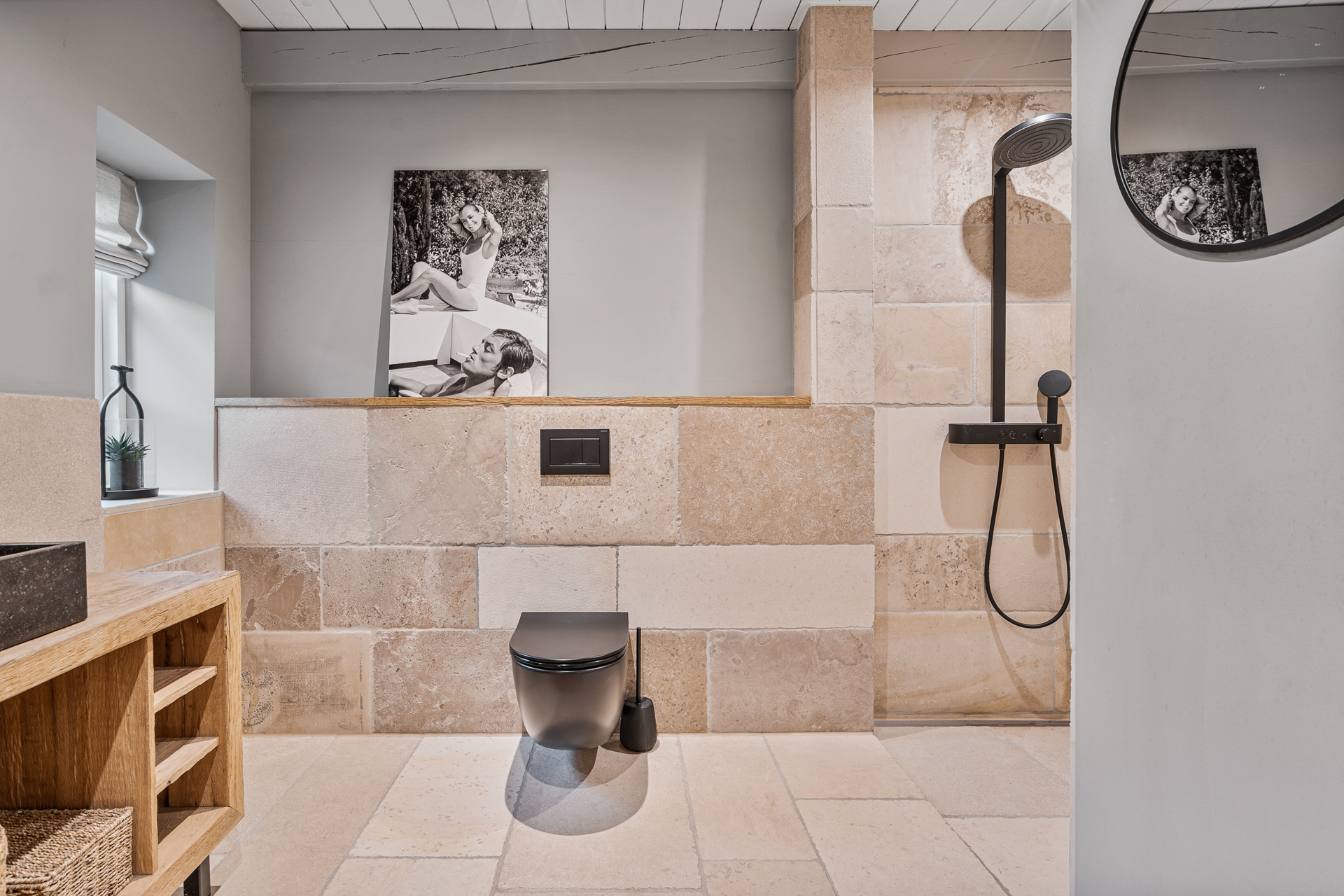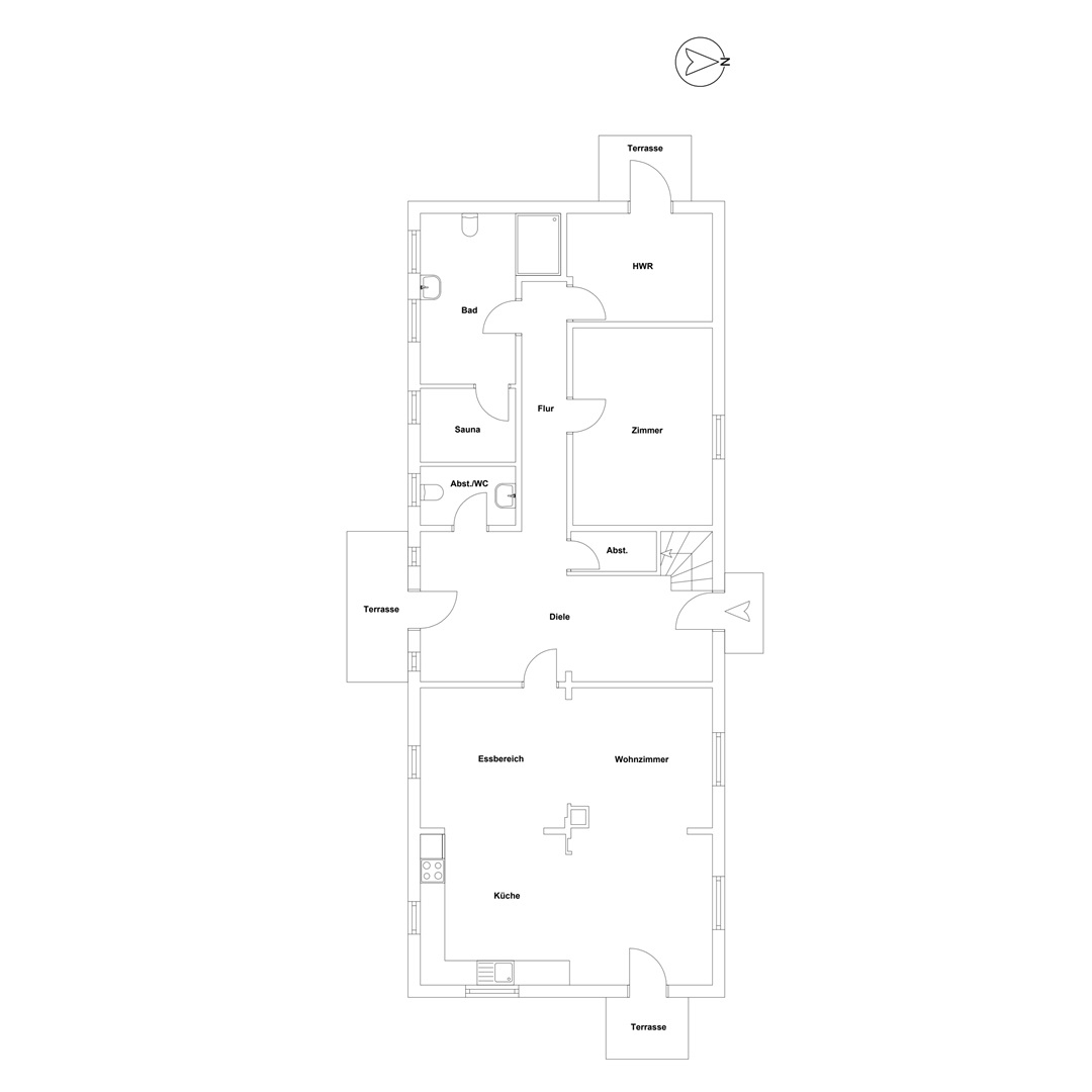 Im Erdgeschoss befinden sich zudem ein praktischer Abstellraum, der alternativ auch als weiteres Badezimmer genutzt werden kann, da sämtliche Anschlüsse bereits vorhanden sind, ein großzügiges Badezimmer mit Regendusche und integrierter Sauna, ein Hauswirtschaftsraum sowie ein ebenerdiges Schlafzimmer, das sich ideal auch für altersgerechtes Wohnen eignet.