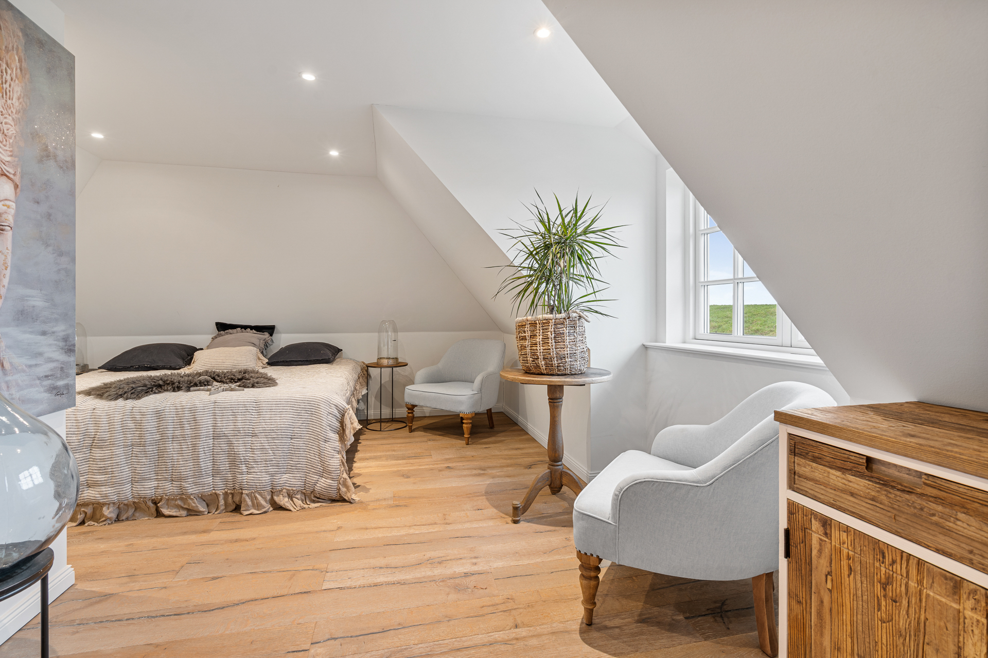 Das Obergeschoss beherbergt zwei großzügige Schlafzimmer, jeweils mit integrierten Ankleidebereichen, sowie ein stilvoll gestaltetes Badezimmer. Ein besonderes Highlight ist der offene Galeriebereich, von dem aus sich ein beeindruckender Blick über den Deich und das Katinger Watt eröffnet und der sich hervorragend als Lese, Arbeits- oder Rückzugsbereich eignet.
