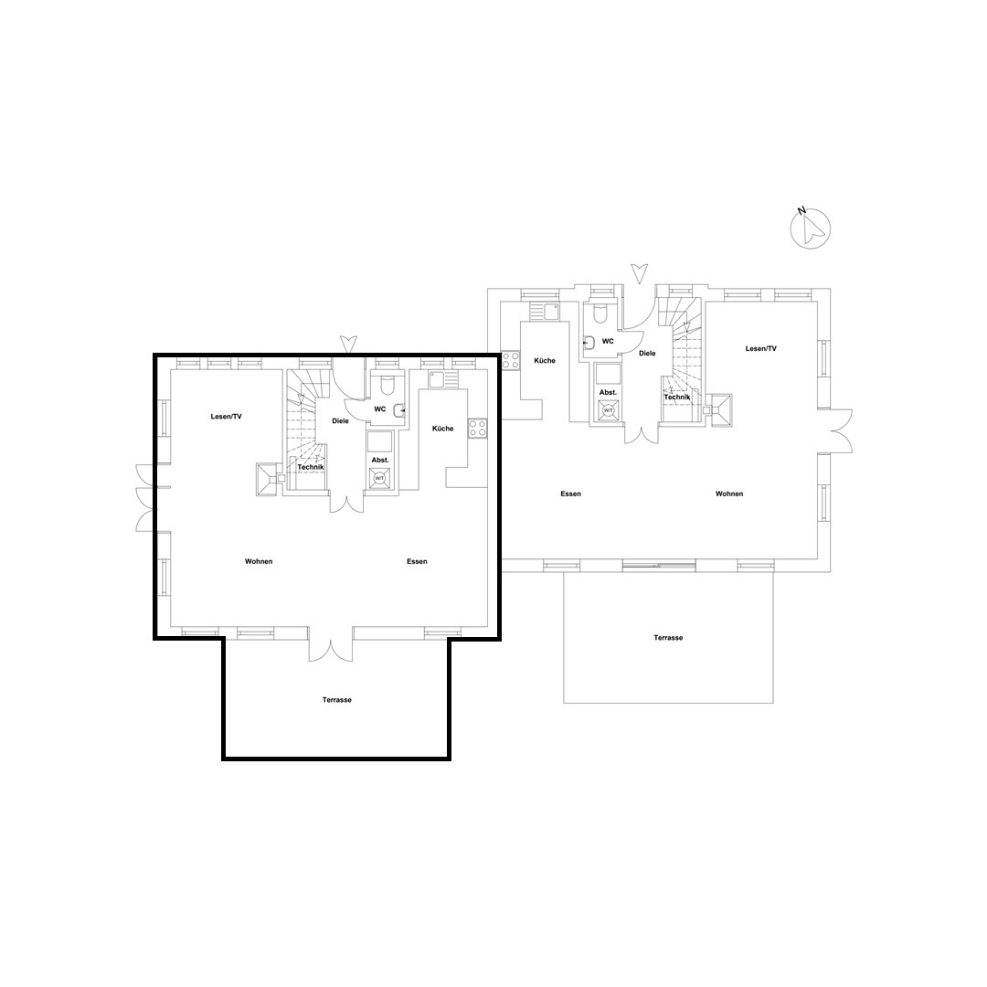 Im Erdgeschoss empfängt Sie ein großzügiger Wohnbereich, der nahtlos in eine offenen Küchenbereich übergeht. Ein Gäste-WC und ein Technikbereich runden das Angebot auf dieser Etage ab.