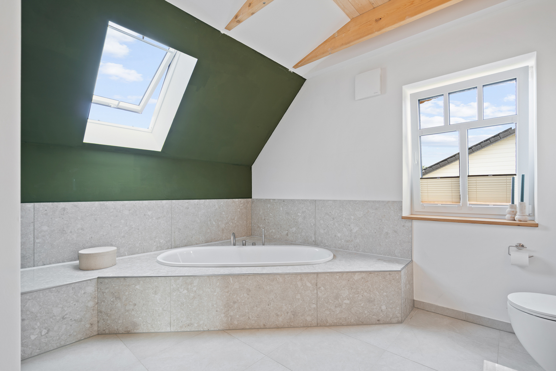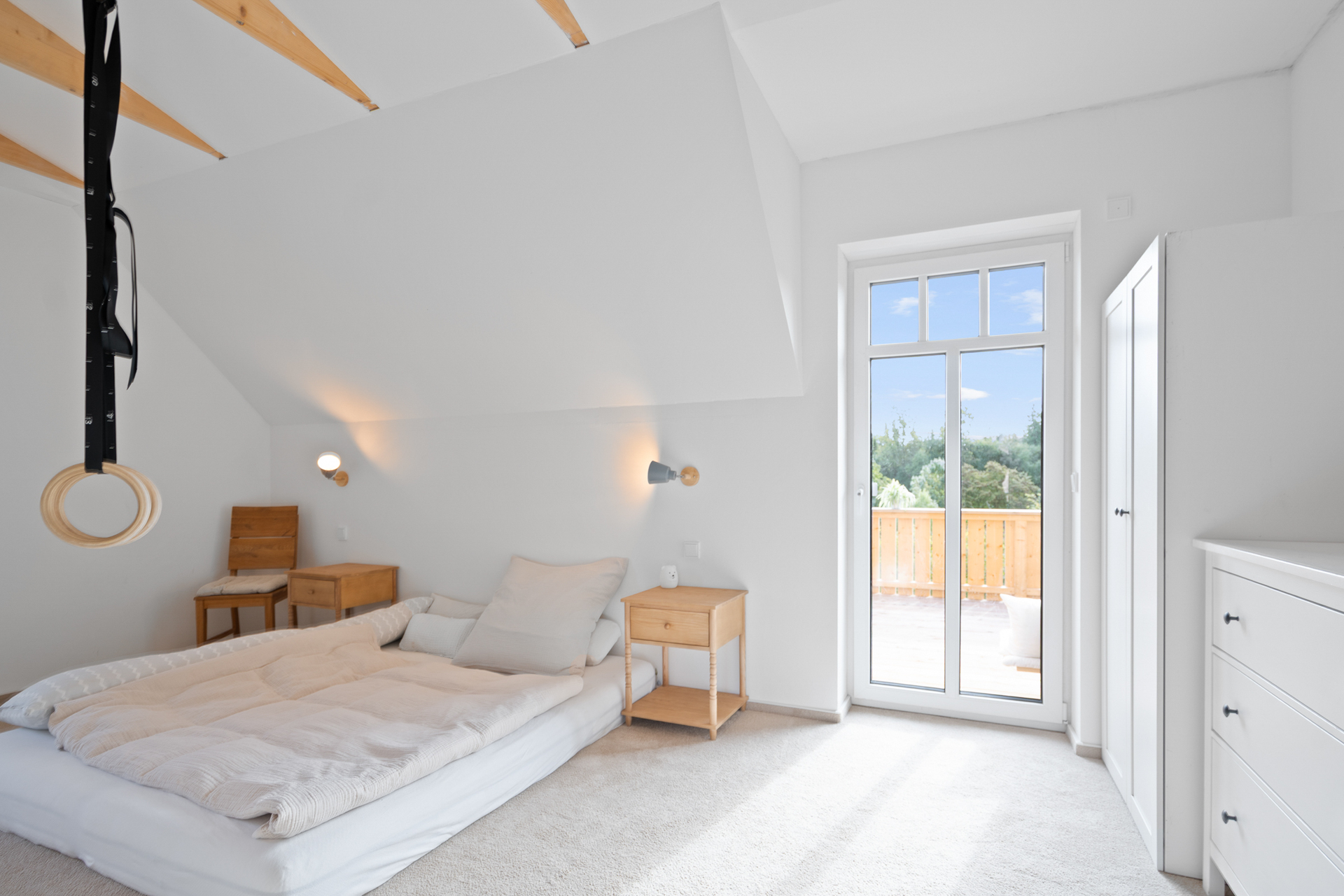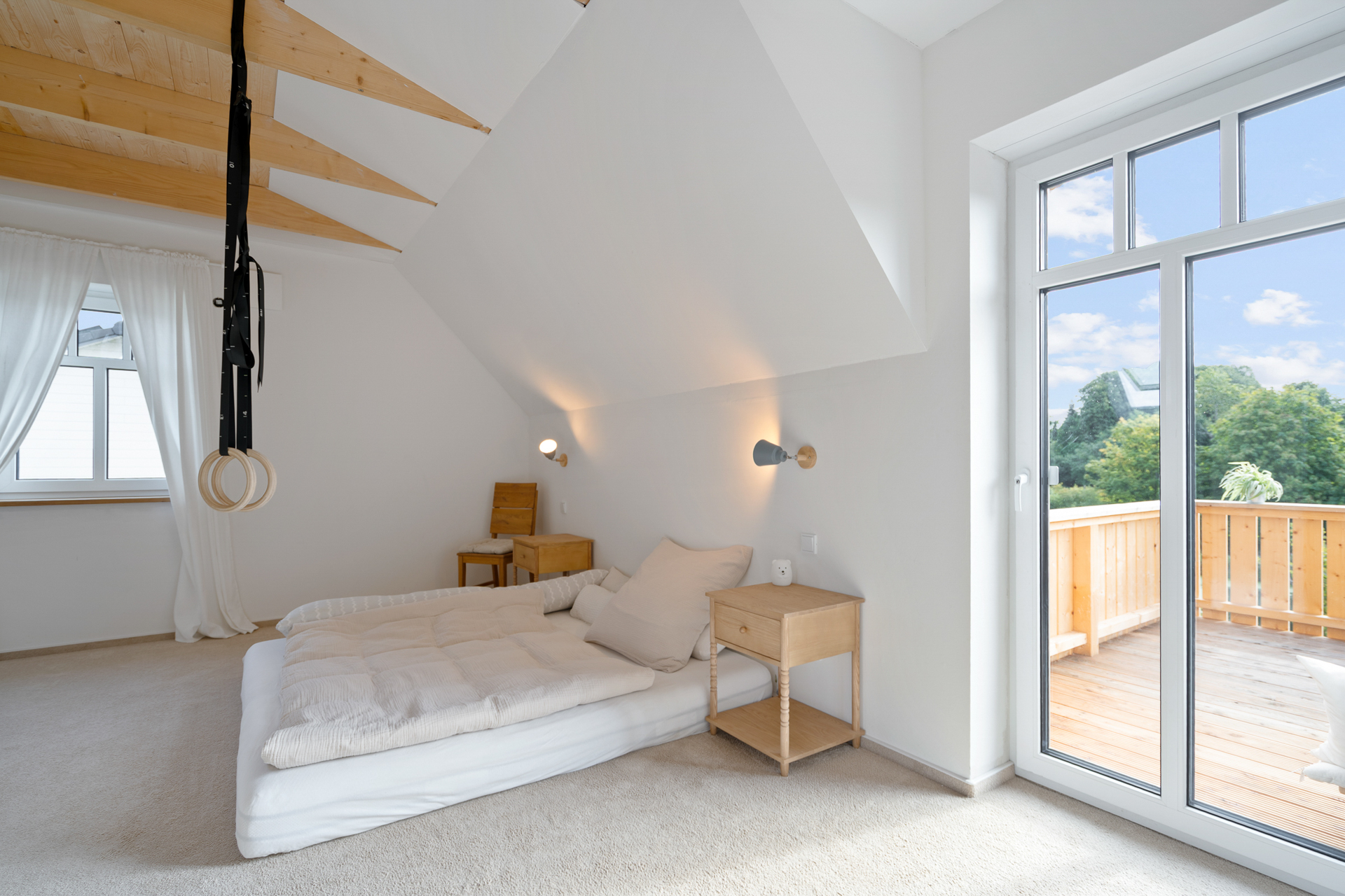 Über eine geschwungene Echtholz-Betontreppe mit massiven Eichenstufen gelangen Sie ins Obergeschoss. Die offene Galerie mit maßgefertigtem Glasgeländer verbindet die Ebenen elegant und unterstreicht das luftige Raumkonzept. Hier befinden sich zwei helle Kinderzimmer, von denen eines Zugang zum Balkon mit warmen Holzdielen und unverbaubarem Blick über die idyllischen Teiche bietet. Das separate Kinderbad ist funktional und hochwertig ausgestattet. Das Elternschlafzimmer verfügt ebenfalls über einen direkten Zugang zum Balkon und lädt mit seinem freien Blick ins Grüne zum Verweilen ein. Das angeschlossene Bad en Suite überzeugt mit moderner Steinoptik, einer bodengleichen Dusche mit integrierter Sitzbank sowie einer stilvoll eingelassenen Badewanne. Tageslicht fällt durch das Dachflächenfenster und schafft in Kombination mit der sichtbaren Holzdecke eine besonders wohnliche Atmosphäre. Ein großzügiger Dachboden rundet das Raumangebot ab und bietet vielseitige Nutzungsmöglichkeiten - ob als Stauraum oder für einen späteren Ausbau.