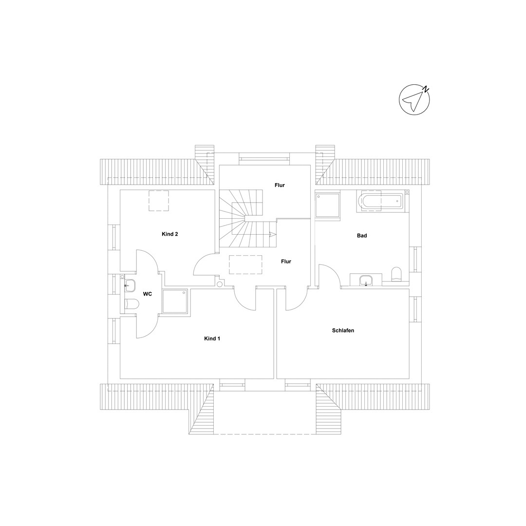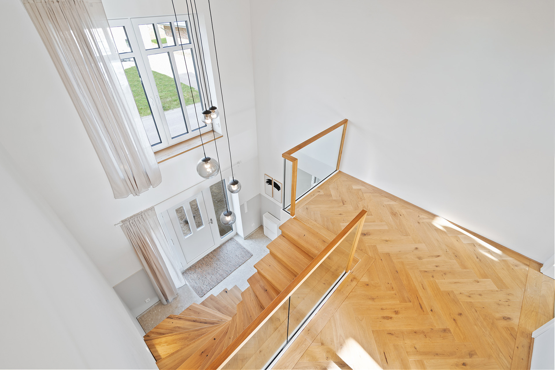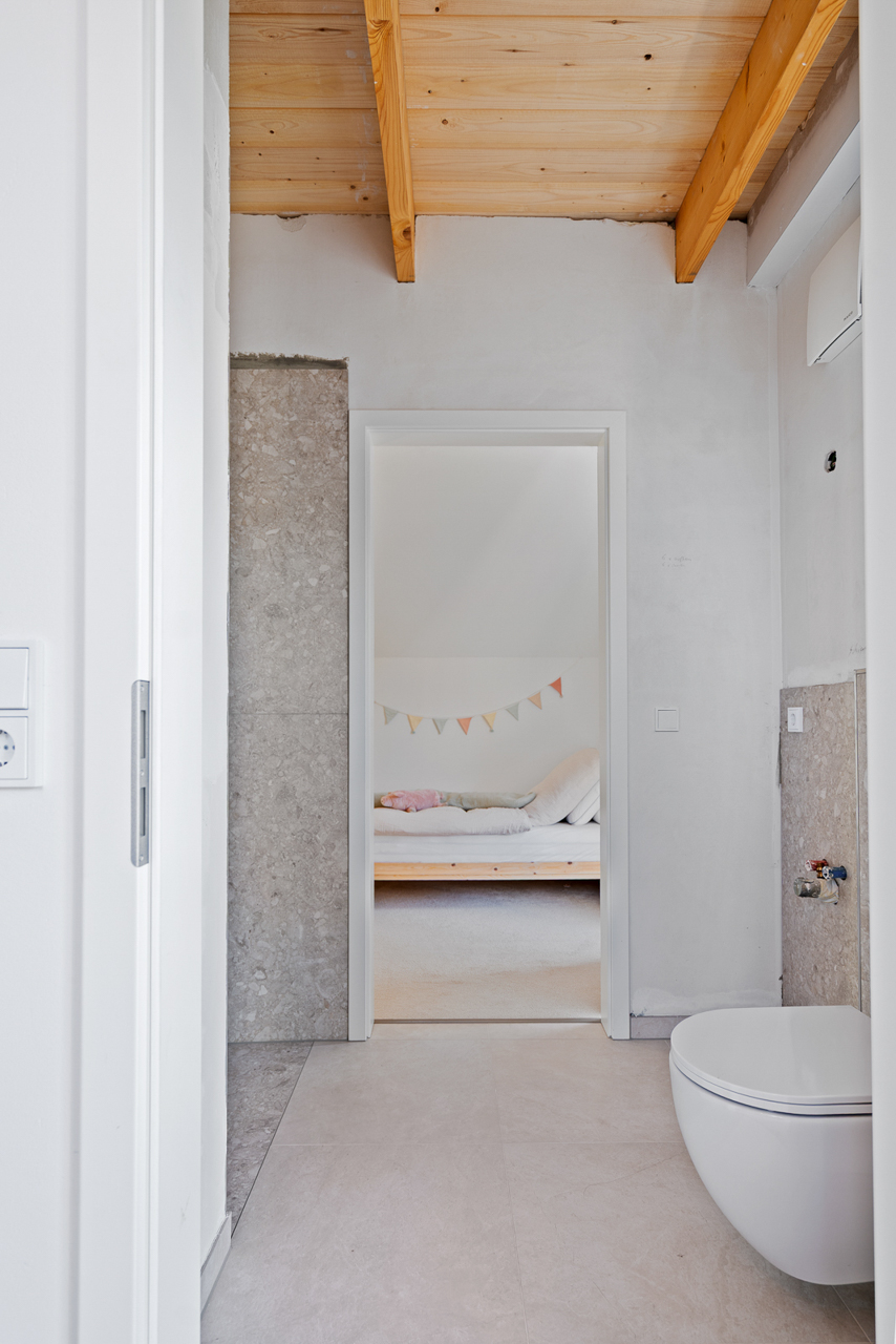 Über eine geschwungene Echtholz-Betontreppe mit massiven Eichenstufen gelangen Sie ins Obergeschoss. Die offene Galerie mit maßgefertigtem Glasgeländer verbindet die Ebenen elegant und unterstreicht das luftige Raumkonzept. Hier befinden sich zwei helle Kinderzimmer, von denen eines Zugang zum Balkon mit warmen Holzdielen und unverbaubarem Blick über die idyllischen Teiche bietet. Das separate Kinderbad ist funktional und hochwertig ausgestattet. Das Elternschlafzimmer verfügt ebenfalls über einen direkten Zugang zum Balkon und lädt mit seinem freien Blick ins Grüne zum Verweilen ein. Das angeschlossene Bad en Suite überzeugt mit moderner Steinoptik, einer bodengleichen Dusche mit integrierter Sitzbank sowie einer stilvoll eingelassenen Badewanne. Tageslicht fällt durch das Dachflächenfenster und schafft in Kombination mit der sichtbaren Holzdecke eine besonders wohnliche Atmosphäre. Ein großzügiger Dachboden rundet das Raumangebot ab und bietet vielseitige Nutzungsmöglichkeiten - ob als Stauraum oder für einen späteren Ausbau.