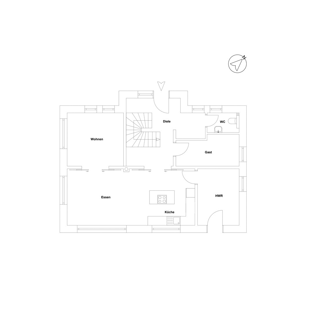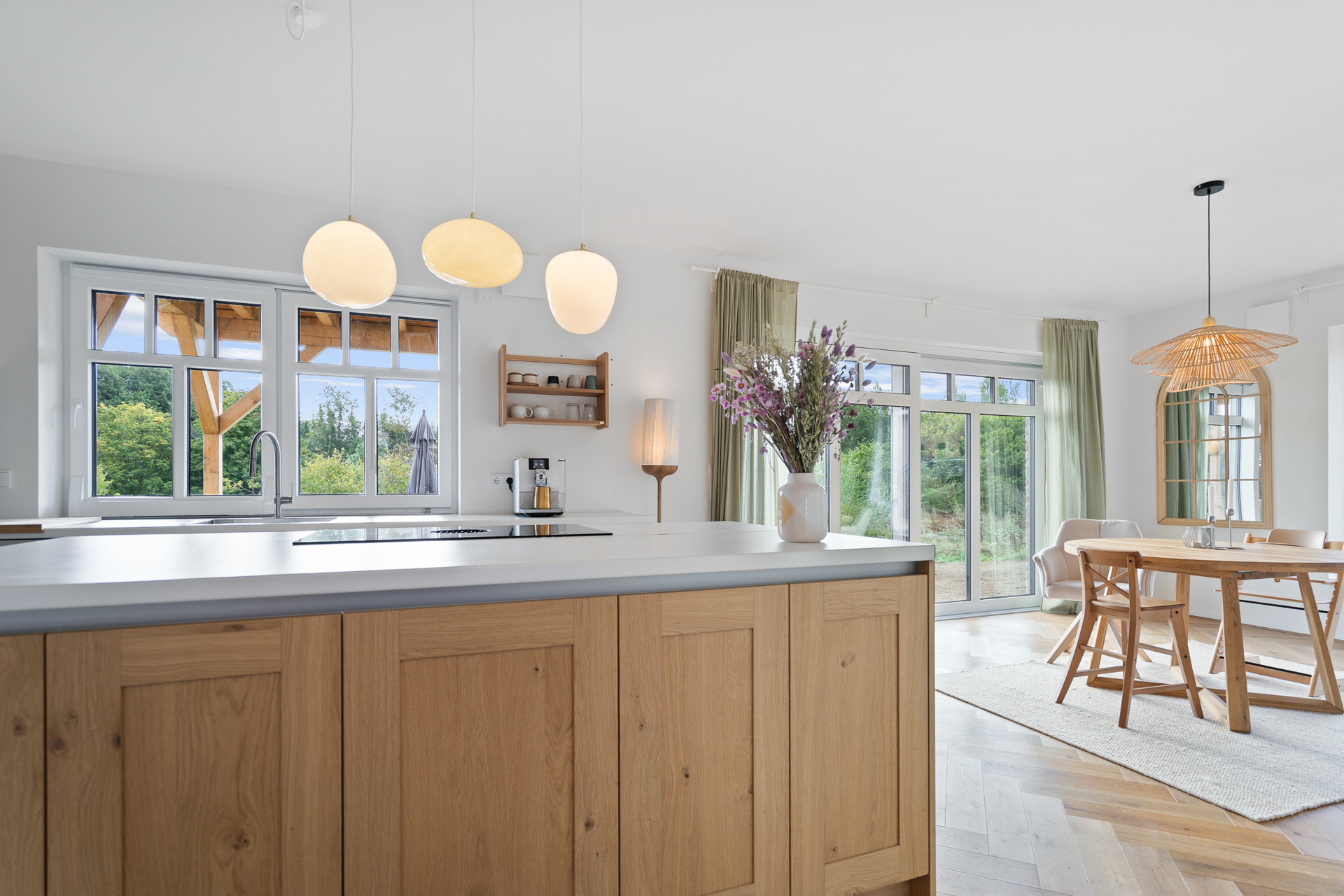 Im Inneren empfängt Sie ein großzügiger Wohn- und Essbereich mit hohen Decken, der durch seine offene Gestaltung ein beeindruckendes Raumgefühl schafft. Herzstück bildet die maßgefertigte Küche mit Kochinsel und Bora-Kochfeldabzug, die Funktionalität und Design auf harmonische Weise verbindet. Der hochwertige Echtholz-Parkettboden aus geölter Eiche in klassischer Fischgrätverlegung verleiht den Räumen eine warme, stilvolle Atmosphäre. Bodentiefe Fenster mit Echtholz-Fensterbänken lassen viel Tageslicht herein und öffnen den Blick ins Grüne. Ein besonderes Highlight ist das bodentiefe Sitzfenster, das sich als außergewöhnlicher Lieblingsplatz mit Blick in den liebevoll angelegten Garten anbietet. Ergänzt wird das Erdgeschoss durch ein stilvolles Gästebad mit hochwertigen Materialien, ein Arbeitszimmer sowie einen großzügigen Hauswirtschaftsraum. Elektrische Jalousien sorgen für zusätzlichen Komfort und optimalen Sonnenschutz.