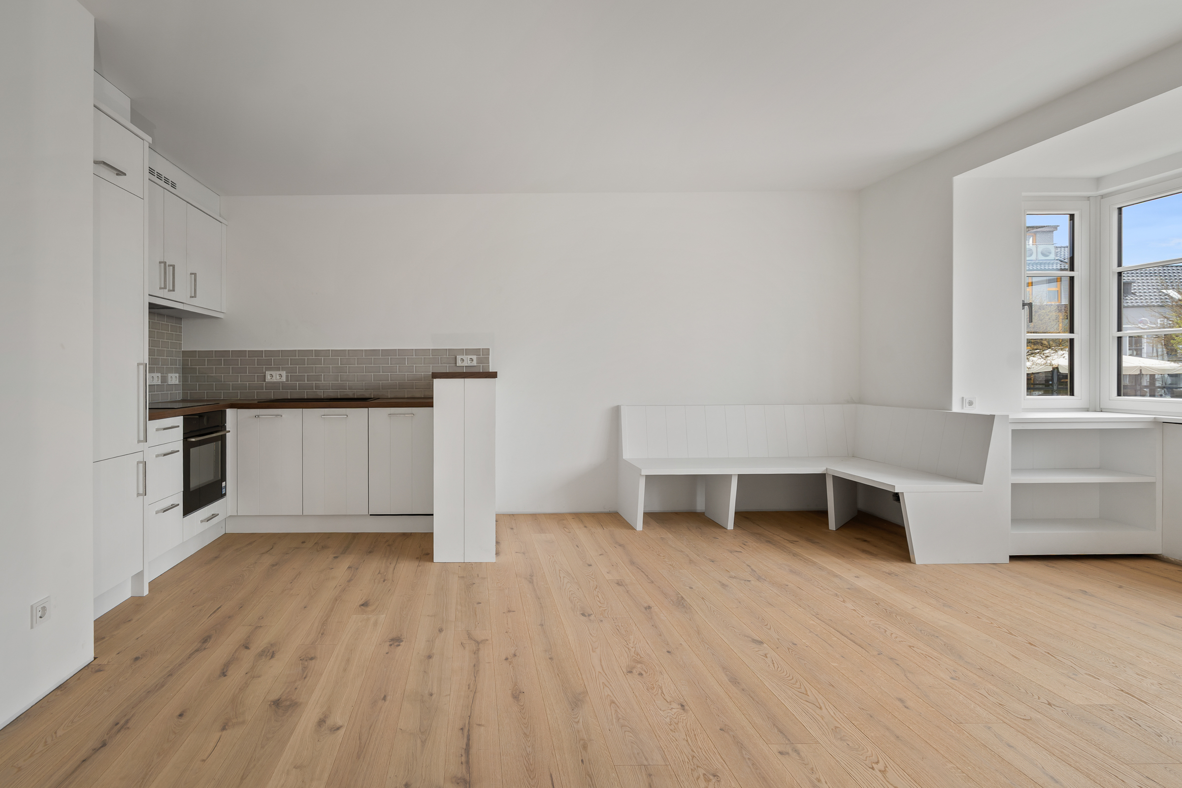 Das Herzstück der Wohnung bildet der offen gestaltete Wohn-, Ess- und Küchenbereich, der viel Raum für entspannte Stunden und geselliges Beisammensein bietet. Große Fensterflächen sorgen für eine helle und freundliche Atmosphäre.