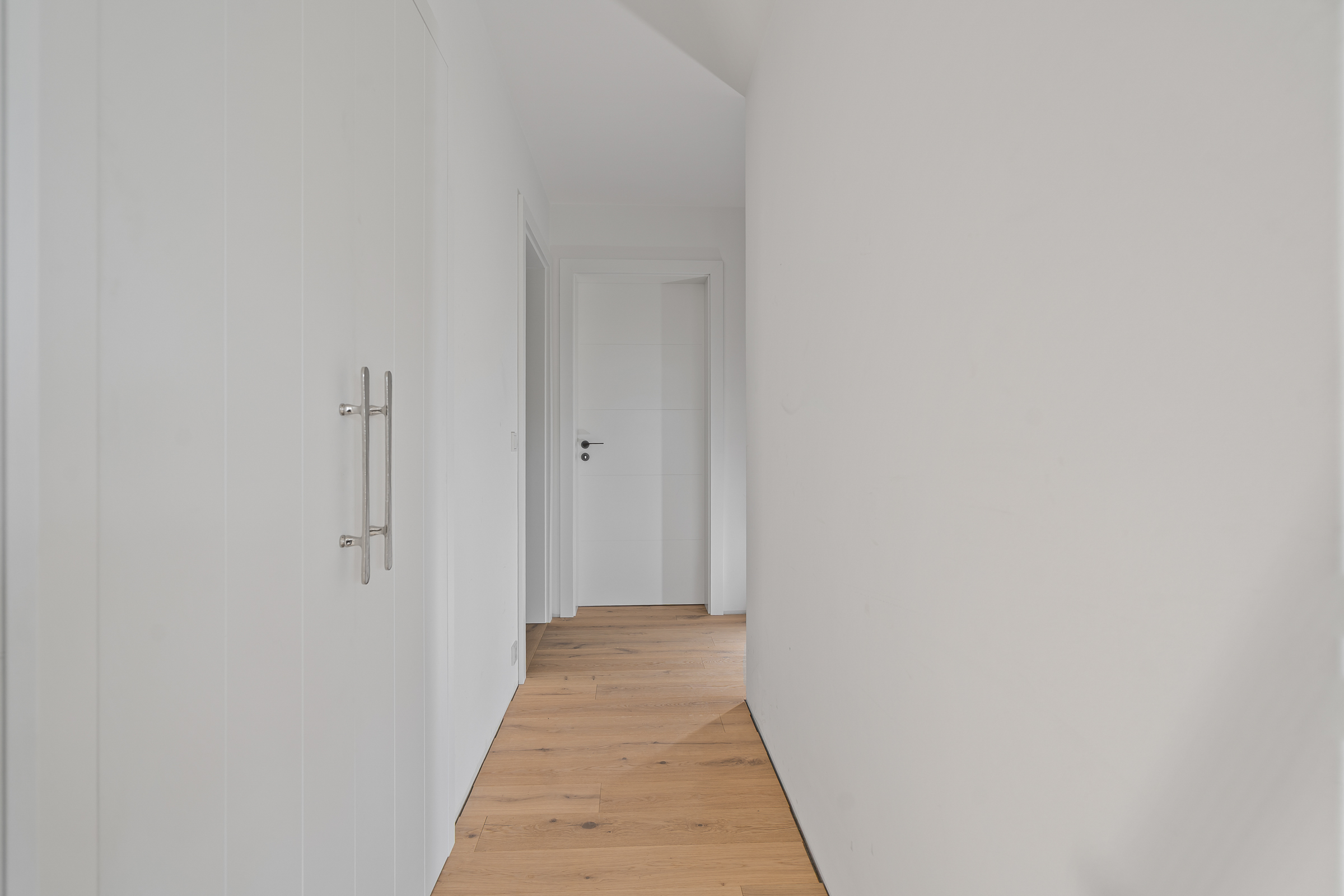 Die gesamte Wohnung ist mit einem edlen Eichenholzfußboden ausgestattet, der eine warme und zugleich elegante Atmosphäre schafft. Hochwertige Tischlereinbauten, darunter maßgefertigte Bänke und Schränke, unterstreichen den exklusiven Anspruch dieser Immobilie und sorgen für optimal genutzten Stauraum. Feinsteinzeug in den Sanitärbereichen ergänzt das hochwertige Materialkonzept und verleiht den Räumen eine moderne, zeitlose Optik.