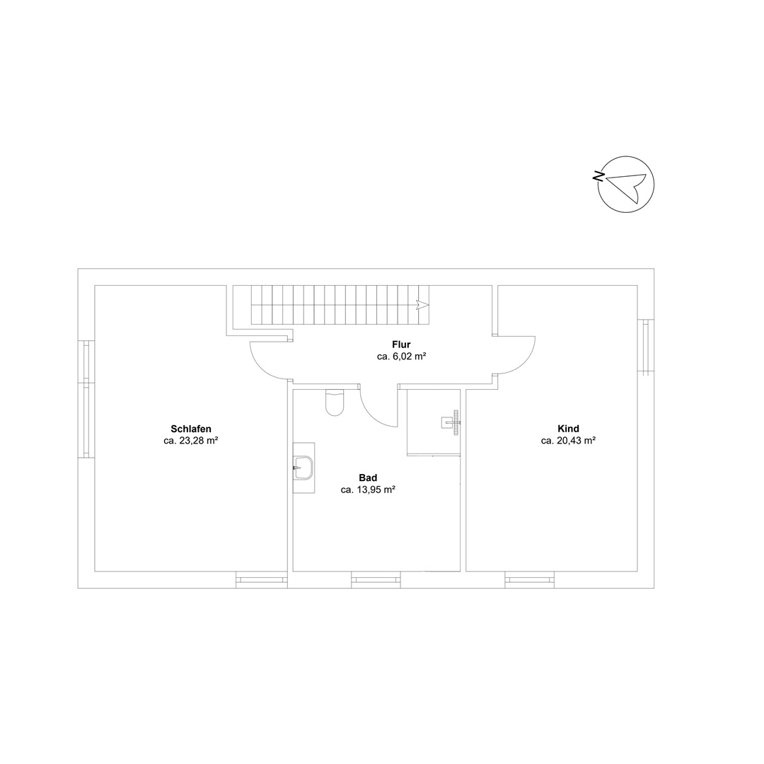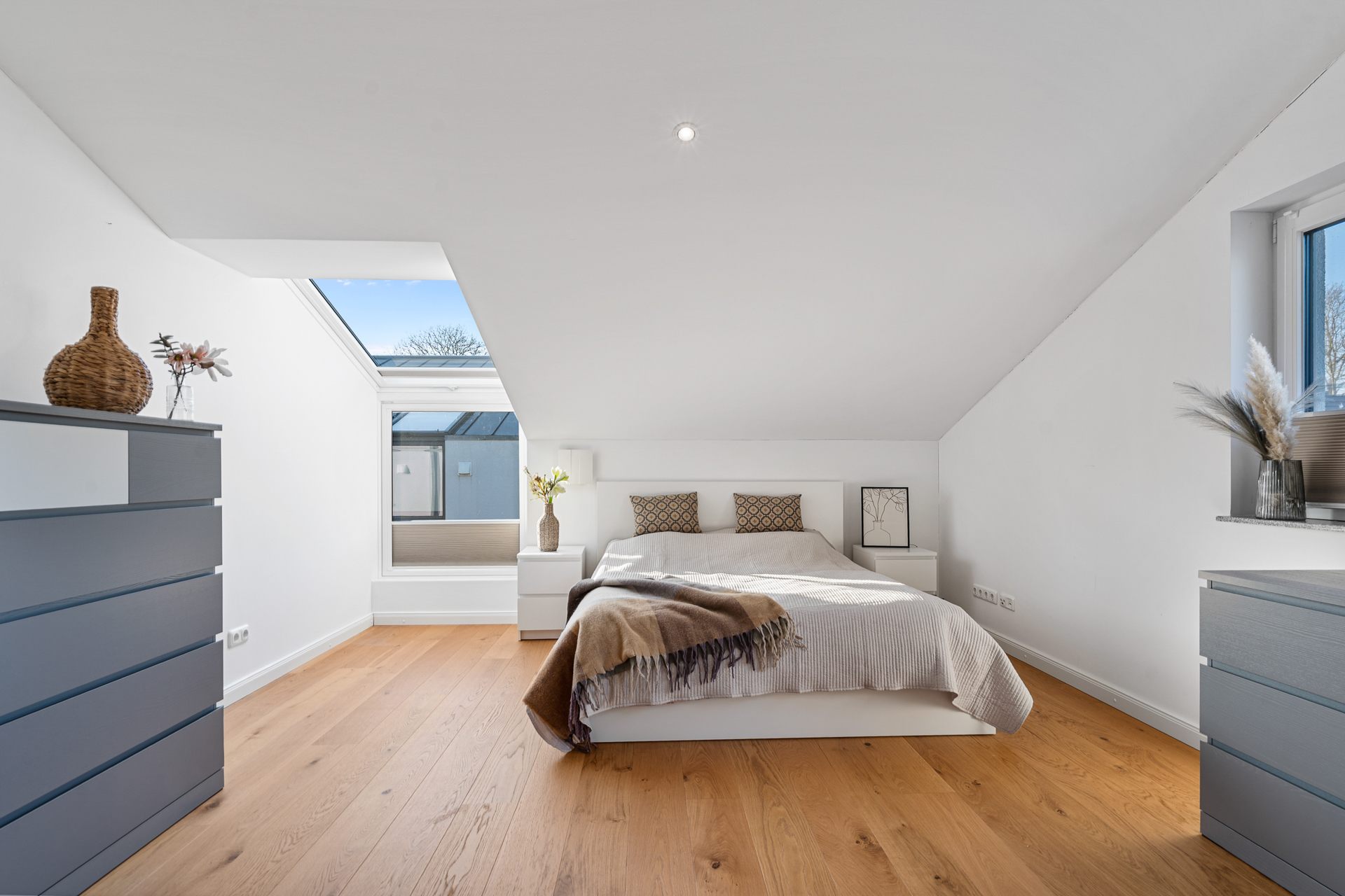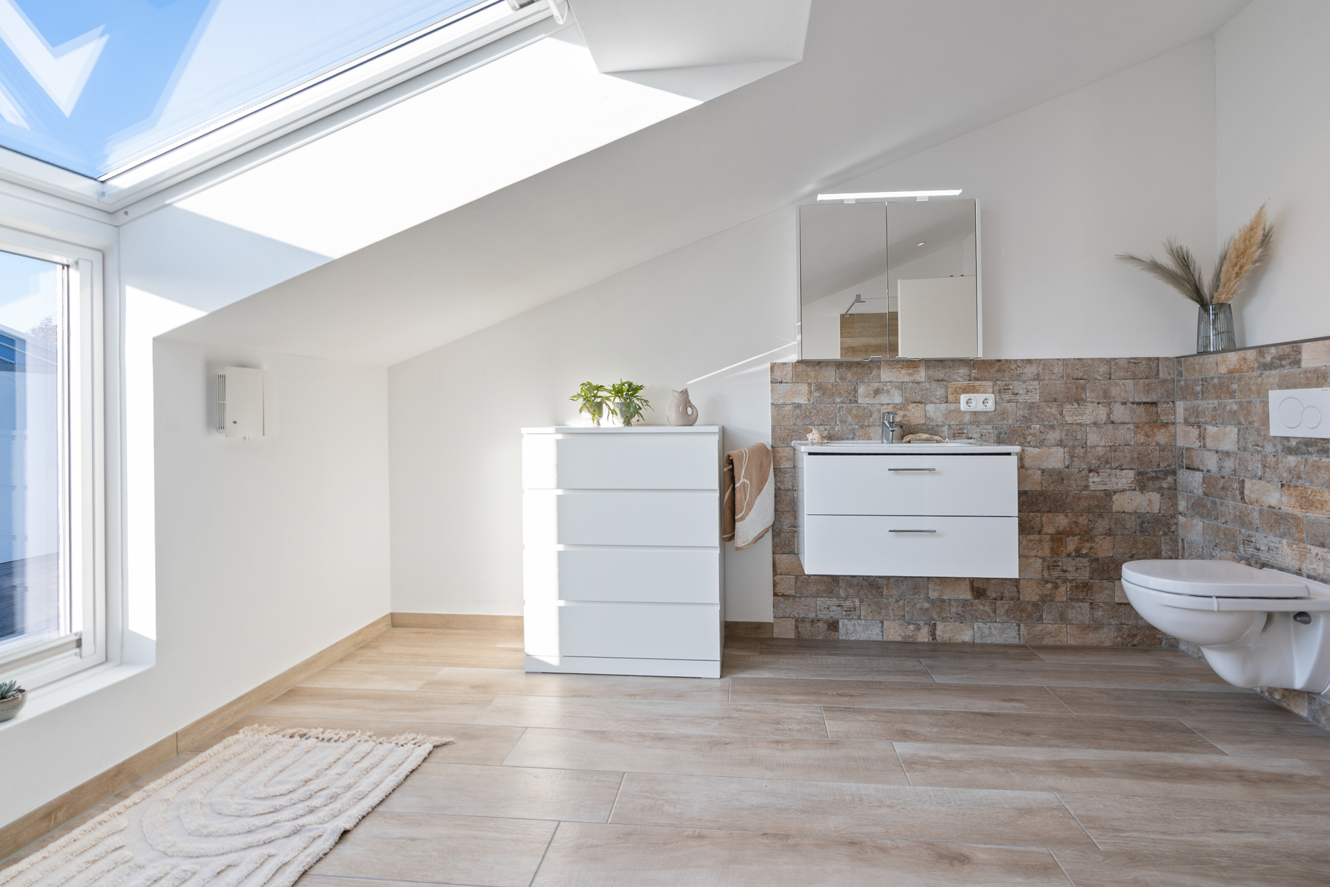 Über die stilvolle Treppe gelangt man ins Obergeschoss, das durch großzügige Fenster- und Dachflächenfenster lichtdurchflutet ist. Im Obergeschoss stehen zwei großzügige Schlafzimmer zur Verfügung, die sich durch ihre ruhige Ausstrahlung und ihre gute Belichtung auszeichnen. Beide Räume bieten ausreichend Platz für komfortable Schlafbereiche sowie zusätzliche Möblierung oder einen kleinen Arbeitsbereich. Das natürliche Tageslicht unterstreicht die warme Wirkung des Holzbodens und sorgt für ein angenehmes Raumgefühl. Das Badezimmer präsentiert sich großzügig und hell. Großformatige Bodenfliesen, eine bodentiefe Dusche sowie die gemauerte Wandverkleidung im Waschtischbereich setzen natürliche Akzente und schaffen eine stimmige Atmosphäre. Das Dachflächenfenster setzt einen besonderen Akzent.