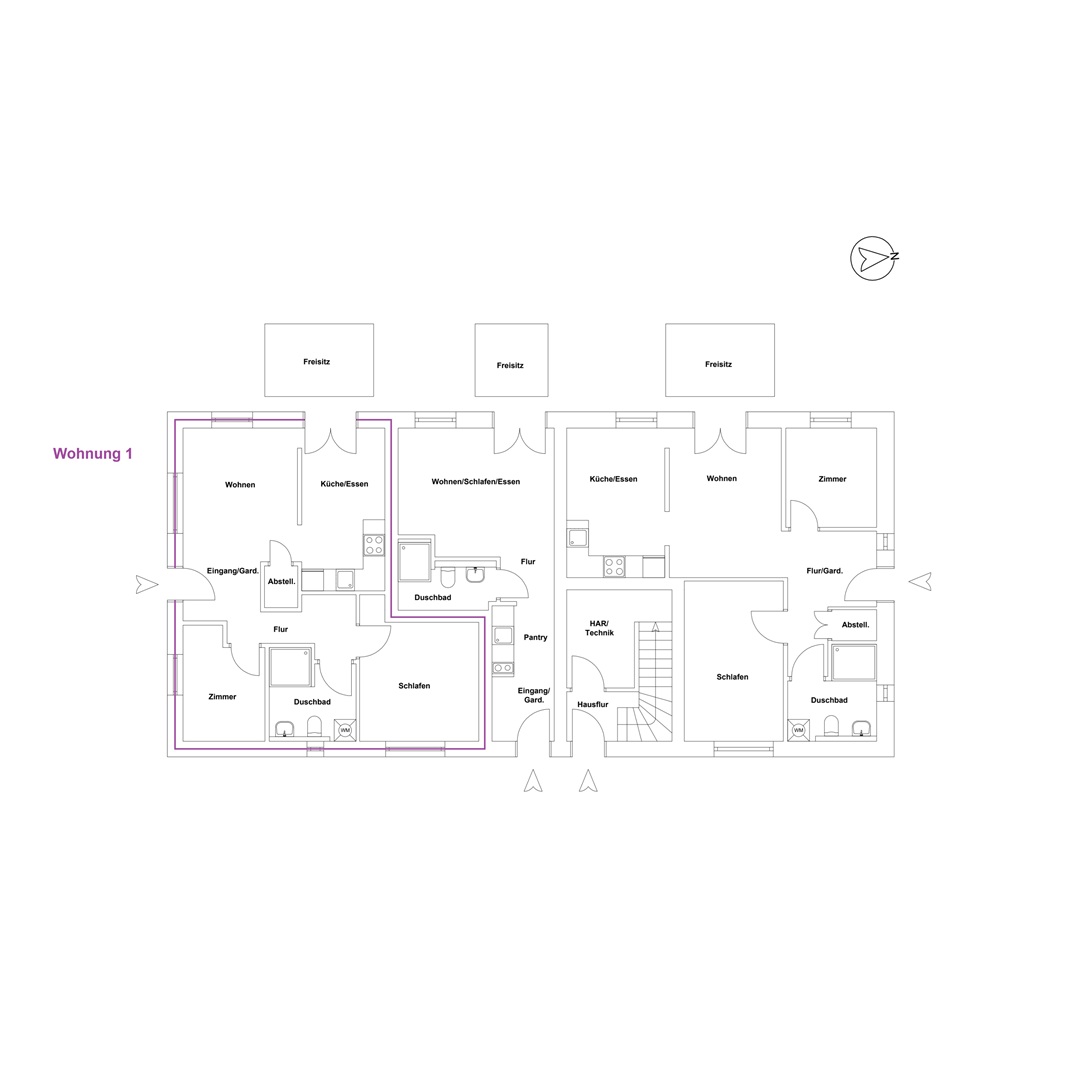 In einem hochwertigen Neubau mit insgesamt fünf Wohneinheiten steht aktuell eine besondere Erdgeschosswohnung zum Verkauf. Eine der Erdgeschosswohnungen ist bereits veräußert, wodurch sich diese Einheit als seltene Gelegenheit präsentiert. Die angebotene Wohnung überzeugt durch außergewöhnliche Privatsphäre. Sie verfügt über einen separaten Eingang, der direkt in den eigenen Eingangsbereich führt und ein hohes Maß an Ruhe und Individualität bietet.