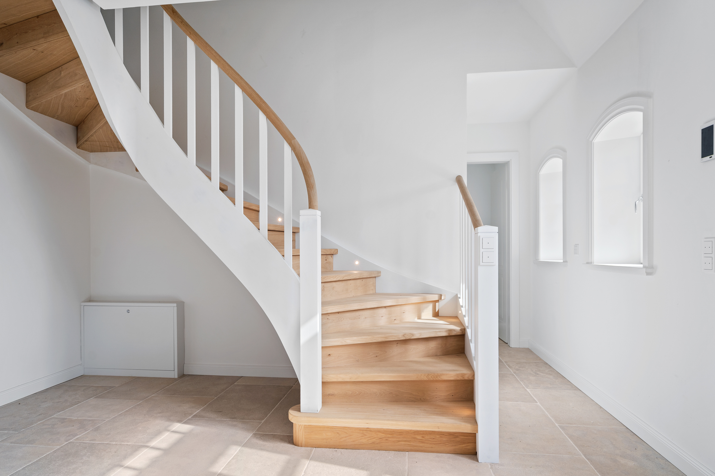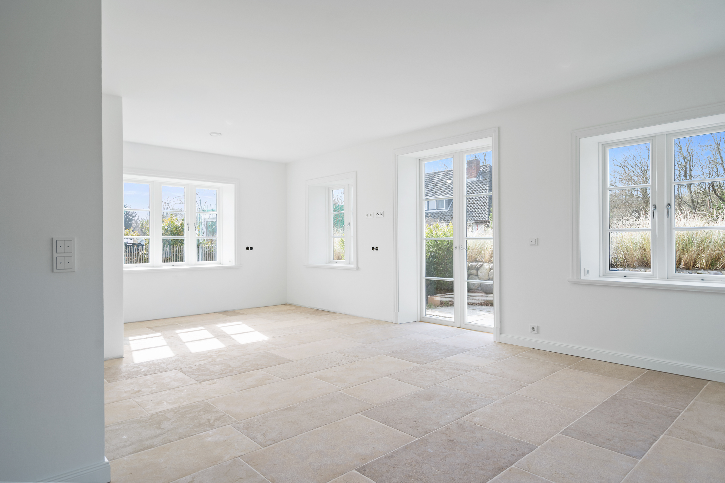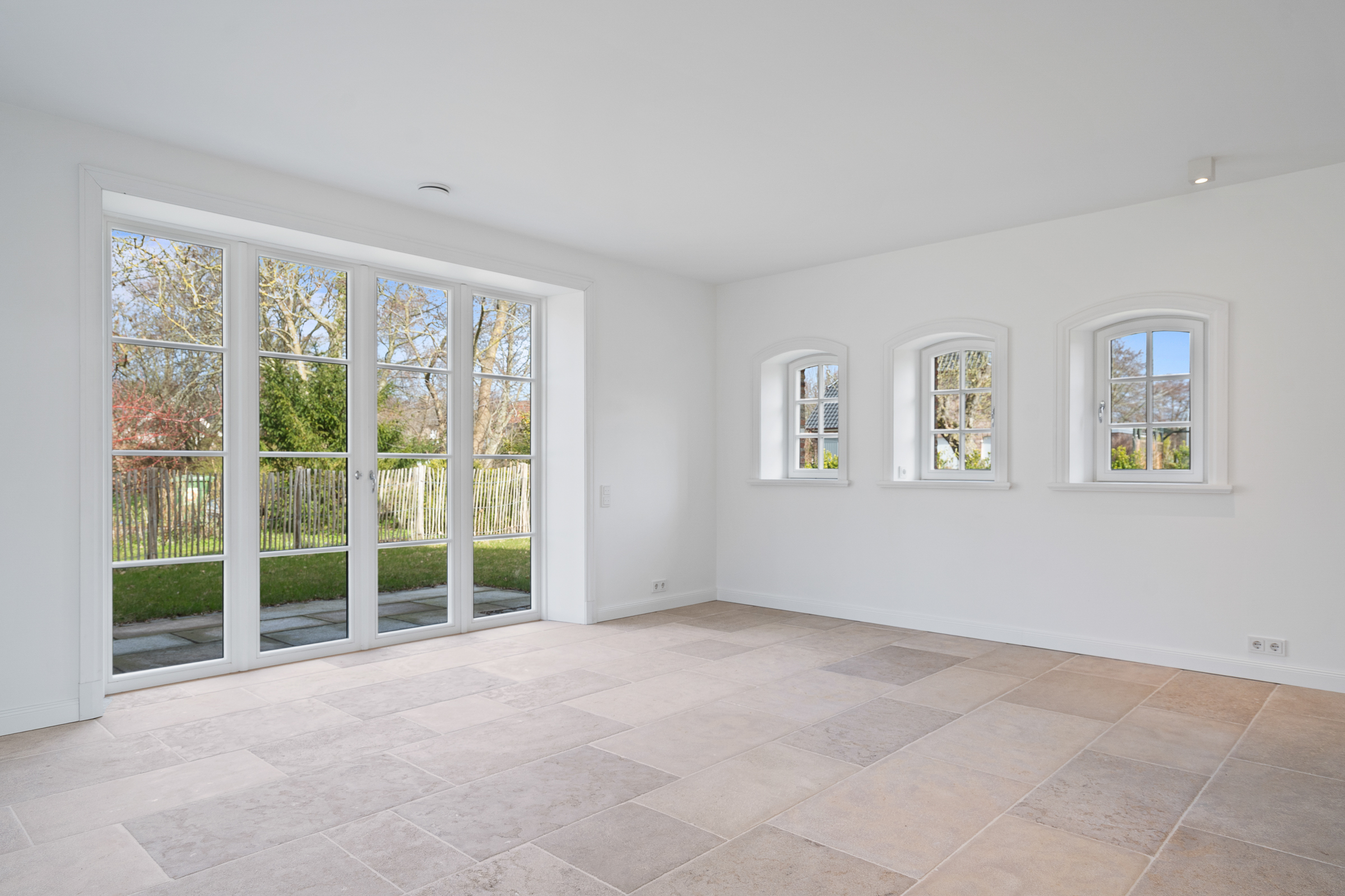 Das Herzstück des Hauses ist der offene, lichtdurchflutete Wohn- und Essbereich mit integrierter Küche. Von hier aus gelangen Sie auf insgesamt drei Terrassen, die je nach Tageszeit zum Verweilen einladen. Großzügige Fenster mit edlen Laibungen und hochwertigen Griffen lassen viel Licht herein und schaffen ein stilvolles Wohnambiente.