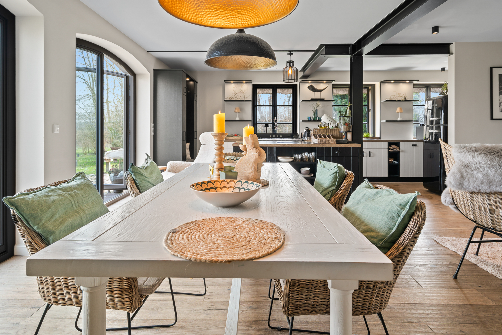 Die Küche, das Herzstück des Hauses, lässt keine kulinarischen Wünsche offen. Sie beeindruckt durch ihre exklusive Landhausoptik und die Rundbogenfenster, die einen atemberaubenden Blick in den liebevoll angelegten Garten ermöglichen. Die Fenster lassen sich vollständig öffnen und verbinden so Innen- und Außenbereich auf harmonische Weise.