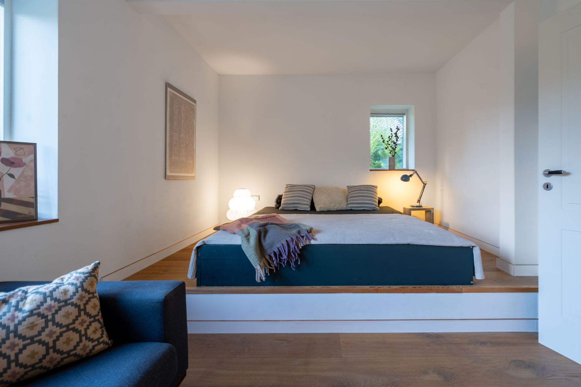 Im Erdgeschoss bildet der offen gestaltete Wohn-, Ess- und Kochbereich das Herzstück des Hauses. Die moderne Wohnküche überzeugt mit ruhigen, zeitgemäßen Fronten und warmen Holzoberflächen, während das angrenzende Wohnzimmer mit seiner klaren Gestaltung und dem Pelletofen eine angenehme, wohnliche Atmosphäre schafft. Beide Bereiche stehen in direktem Bezug zueinander und wirken durch ihre abgestimmte Material- und Formensprache harmonisch verbunden. Großzügige Fensterflächen und die bodentiefe Terrassentür öffnen den gesamten Wohnbereich zum eingewachsenen Garten. Sie lassen viel Tageslicht herein, schaffen eine leichte, freundliche Raumwirkung und ermöglichen den direkten Übergang auf die angrenzende Holzterrasse, wo Innenraum und Natur auf natürliche Weise ineinander übergehen und sich ein entspannter Wohncharakter entfaltet. Das Schlafzimmer im Erdgeschoss wirkt hell und angenehm ruhig. Die dezente Podestlösung setzt innerhalb des Raumes einen feinen architektonischen Akzent und verleiht ihm eine leichte räumliche Staffelung. Direkt angrenzend befindet sich das Bad en suite, das mit einer großzügigen Walk-in-Dusche, hochwertigen Oberflächen und einer modernen, klaren Gestaltung überzeugt.