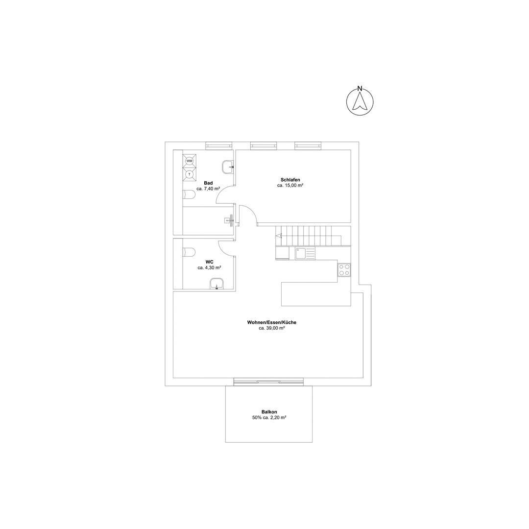 Über einen separaten Zugang führt der Weg in das Dachgeschoss, das als vollwertige zweite Wohneinheit genutzt werden kann. Auch hier prägen das Eiche-Echtholzparkett und die hochwertigen Holz-Alu-Fenster das wohnliche Gesamtbild und schaffen eine warme, stimmige Atmosphäre. Der großzügige Wohn- und Kochbereich erhält durch mehrere Dachfenster ein leichtes, offenes Raumgefühl, während sichtbare Holzbalken dem Bereich eine charaktervolle, loftartige Note verleihen. Die Küche orientiert sich an skandinavischem Design: ruhige Grautöne, klare Formen und natürliche Holzarbeitsflächen erzeugen ein unaufdringlich elegantes, behagliches Ambiente. Die breite Fensterfront öffnet den Wohnbereich zur überdachten Dachterrasse mit schönem Blick ins umliegende Grün. Sie verbindet den Innenraum mit der Natur und schafft einen Ort des Morgenlichts, des Weitblicks und entspannter Momente im Freien.