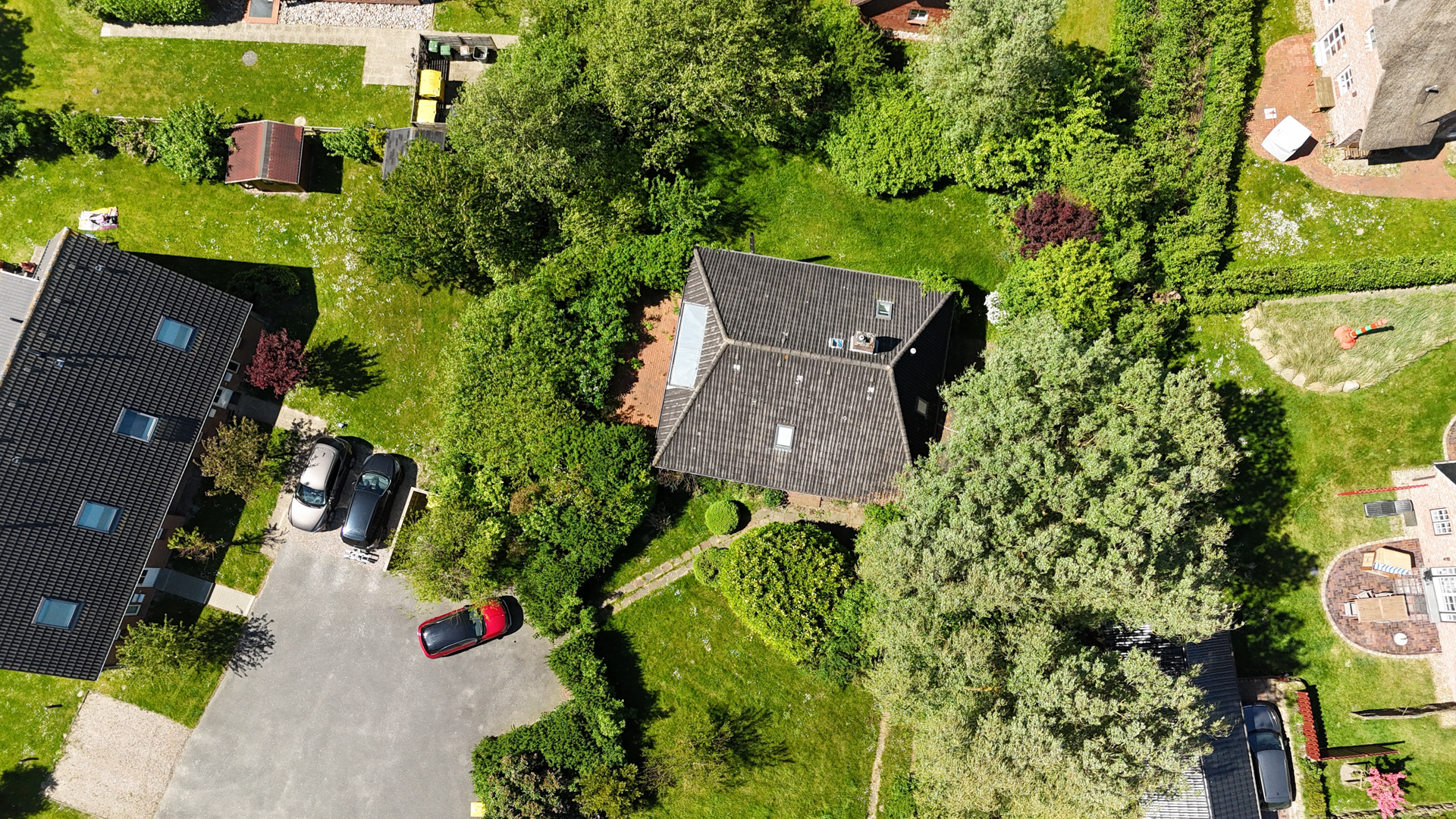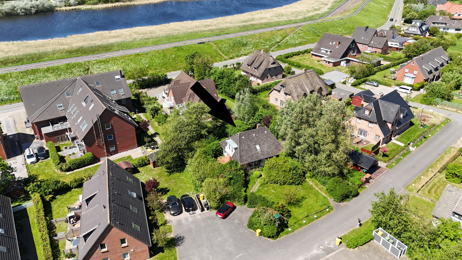 Das Haus steht auf einem großzügigen Grundstück von 1.024 m² in zweiter Reihe hinter dem Deich – eine ruhige und geschützte Lage in Ording, die dennoch zentral gelegen ist. Der weitläufige Garten bietet zahlreiche Gestaltungsmöglichkeiten und ausreichend Platz zum Spielen, Gärtnern oder Entspannen.