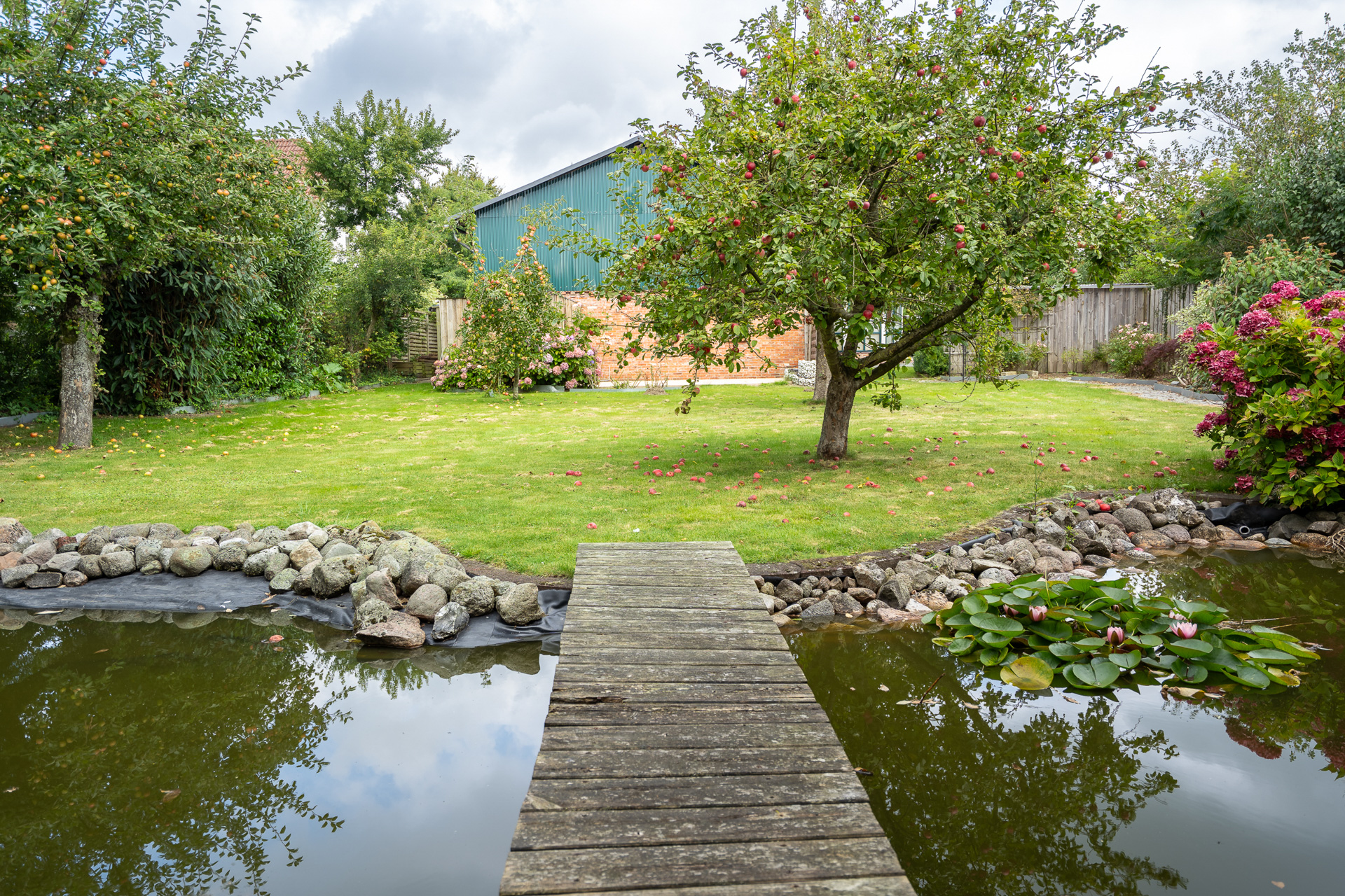 Der gesamte Garten ist kunstvoll angelegt: geschwungene Wege, alter Baumbestand, geschützte Sitzplätze, eine Strandkorb-Ecke und eine stimmige Bepflanzung schaffen eine ganz besondere Atmosphäre. Ein besonders schöner Blickfang ist der Teich, in dem sich im Sommer blühende Seerosen entfalten und für ein stimmungsvolles Gartenbild sorgen. Sowohl im vorderen als auch im hinteren Grundstücksteil entstehen harmonische Rückzugsorte, umgeben von Natur und Geborgenheit. Die lange gepflasterte Einfahrt entlang des Hauses bietet zudem großzügige Stellflächen für mehrere Fahrzeuge.