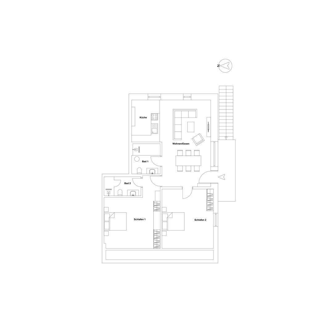 Ein besonderes Highlight dieser Wohnung ist der eigene Treppenaufgang, der Ihnen ein Höchstmaß an Privatsphäre und Unabhängigkeit bietet. Sie betreten die Wohnung und werden sofort von einem großzügigen Wohnbereich empfangen, der zum Verweilen und Entspannen einlädt.