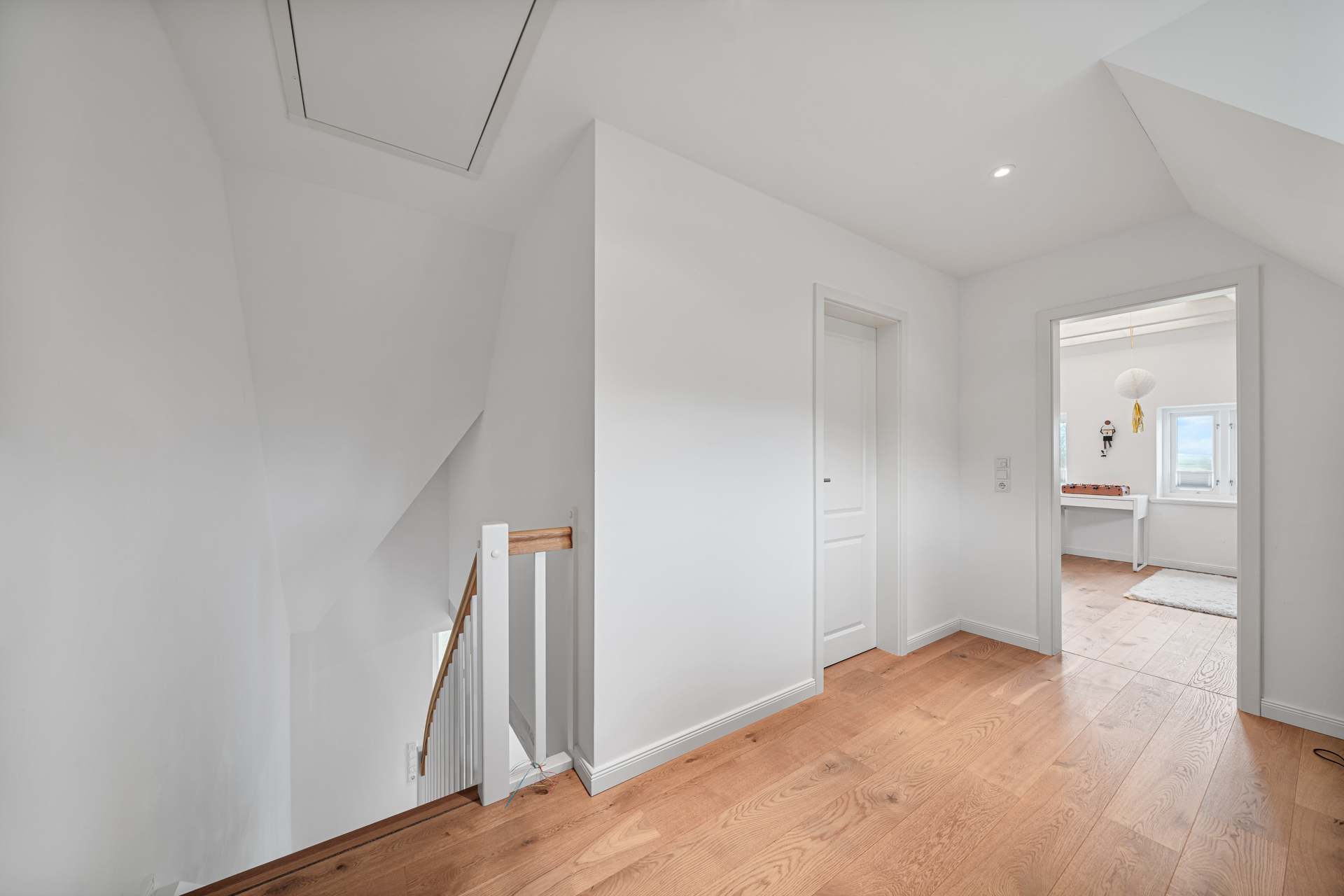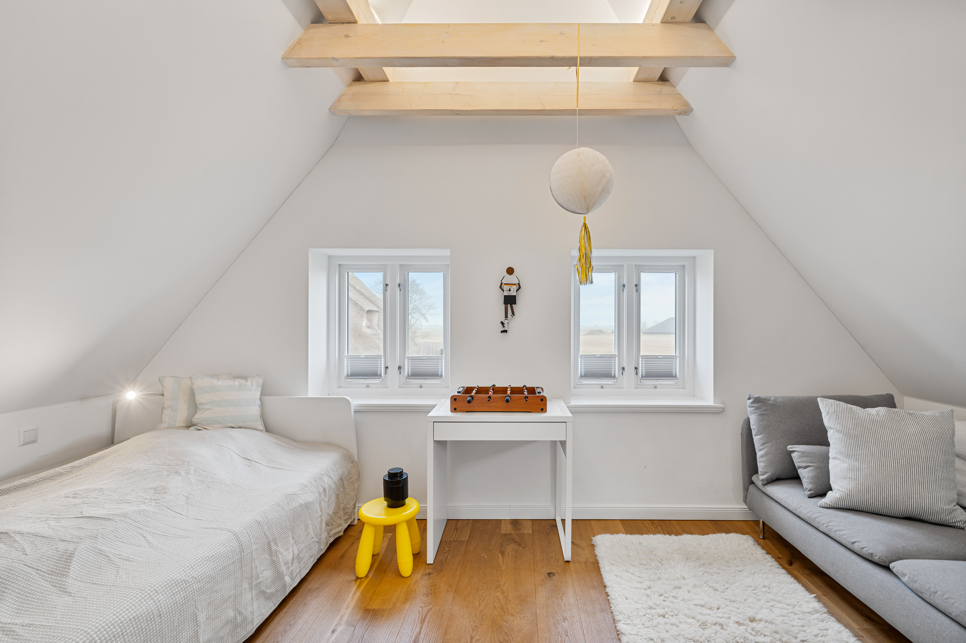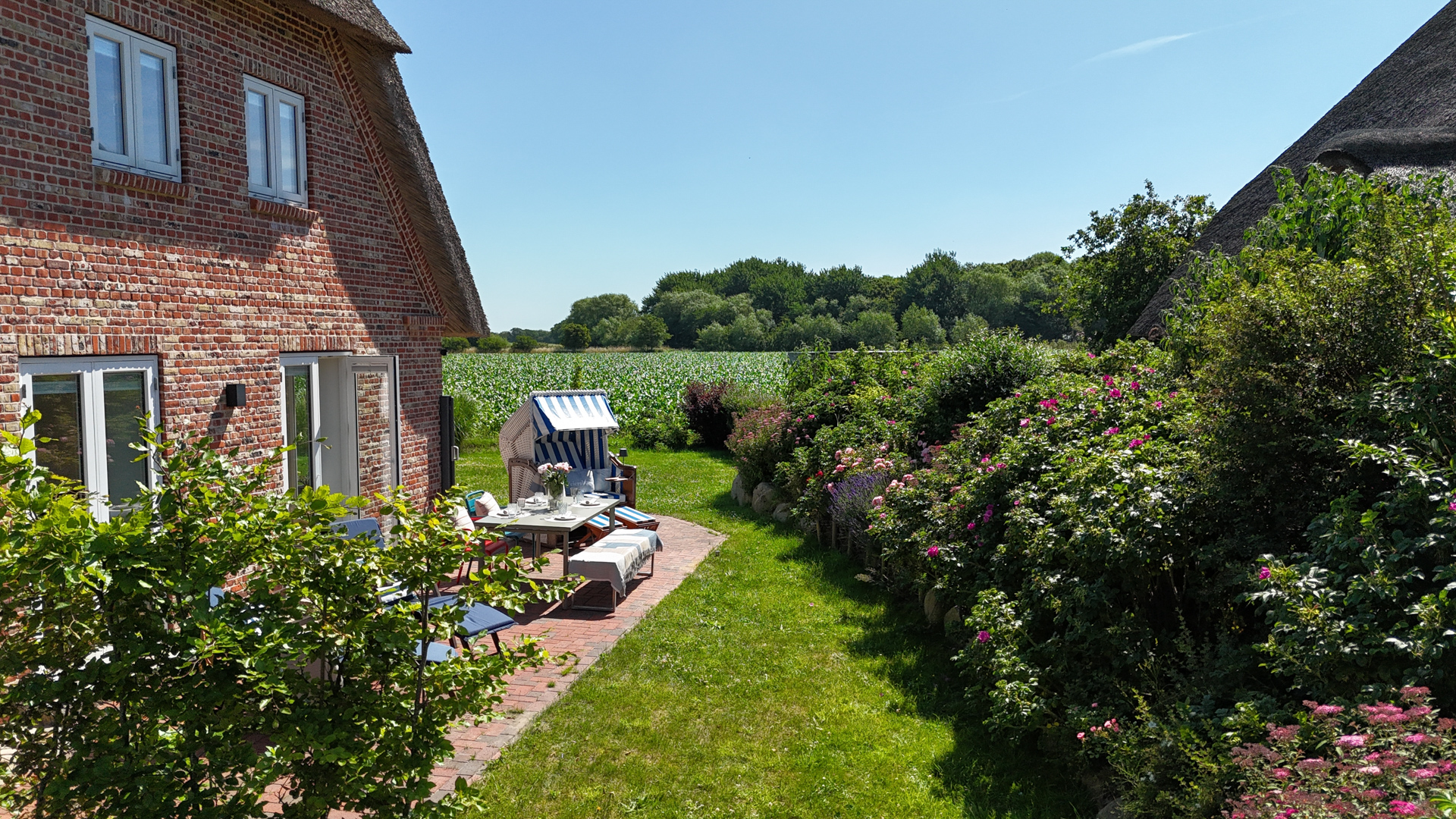 Willkommen in einem Zuhause, das Stil, Nachhaltigkeit und nordischen Charme auf einzigartige Weise vereint. Dieses exklusive Reetdachhaus wurde 2019 inmitten eines harmonischen Ensembles baugleicher Häuser errichtet und liegt in traumhafter Feldrandlage – eingebettet in Ruhe und Natur, mit einem unverbaubaren Blick über weite Wiesen und Felder. Schon der liebevoll angelegte Weg zum Haus vermittelt einen Eindruck dessen, was Sie erwartet: ein durchdachtes Wohnkonzept voller Wärme, Qualität und Klarheit. Beim Betreten des Hauses fallen sofort die hochwertigen Materialien und die Liebe zum Detail ins Auge. Edler Eichenholzboden, elegante Türen mit geschmackvollen Beschlägen, eine imposante Holzbalkendecke sowie die handgefertigte Eichenholztreppe prägen das stilvolle Interieur und sorgen für ein harmonisches Wohngefühl, das skandinavische Leichtigkeit mit architektonischer Präzision verbindet. Herzstück des Hauses ist der offene Wohn- und Essbereich im Erdgeschoss. Großzügig geschnitten, lichtdurchflutet und mit einem herrlichen Blick in die Natur, lädt er zum Verweilen und Wohlfühlen ein. Die moderne, weiße Küche fügt sich nahtlos in die helle Atmosphäre ein und wird durch die gekalkten Holzbalken stilvoll ergänzt. Auf derselben Ebene befindet sich zudem ein geräumiges Schlafzimmer mit traumhaftem Ausblick sowie ein modernes, ebenerdiges Badezimmer. Ein praktischer Hauswirtschaftsraum rundet das Raumangebot im Erdgeschoss ab. Eine elegante Eichentreppe führt ins Obergeschoss, wo eine offene Galerie mit großer Gaube und Weitblick über die Felder begeistert – ideal als Arbeitsplatz, Leseecke oder gemütlicher Rückzugsort. Zwei helle, charmante Kinderzimmer mit sichtbaren Balkenlagen schaffen eine besondere Wohnatmosphäre. Das stilvolle Badezimmer mit großzügiger Badewanne bietet auch hier höchsten Komfort. Neben der stilvollen Gestaltung überzeugt das Haus mit seiner zukunftsweisenden Technik: Eine moderne Erdwärmepumpe mit Tiefenbohrung sorgt zusammen mit der Fußbodenheizung in allen Räumen für angenehme Wärme und höchste Energieeffizienz. Das Gebäude erfüllt mit der Energieeffizienzklasse A+ höchste Standards für nachhaltiges Wohnen – ökologisch wie ökonomisch. Dänische Holzfenster, die sich nach außen öffnen lassen, unterstreichen den hohen Anspruch an Qualität und Design. Ein großzügiger Carport mit moderner Wallbox ist bereits vorhanden.