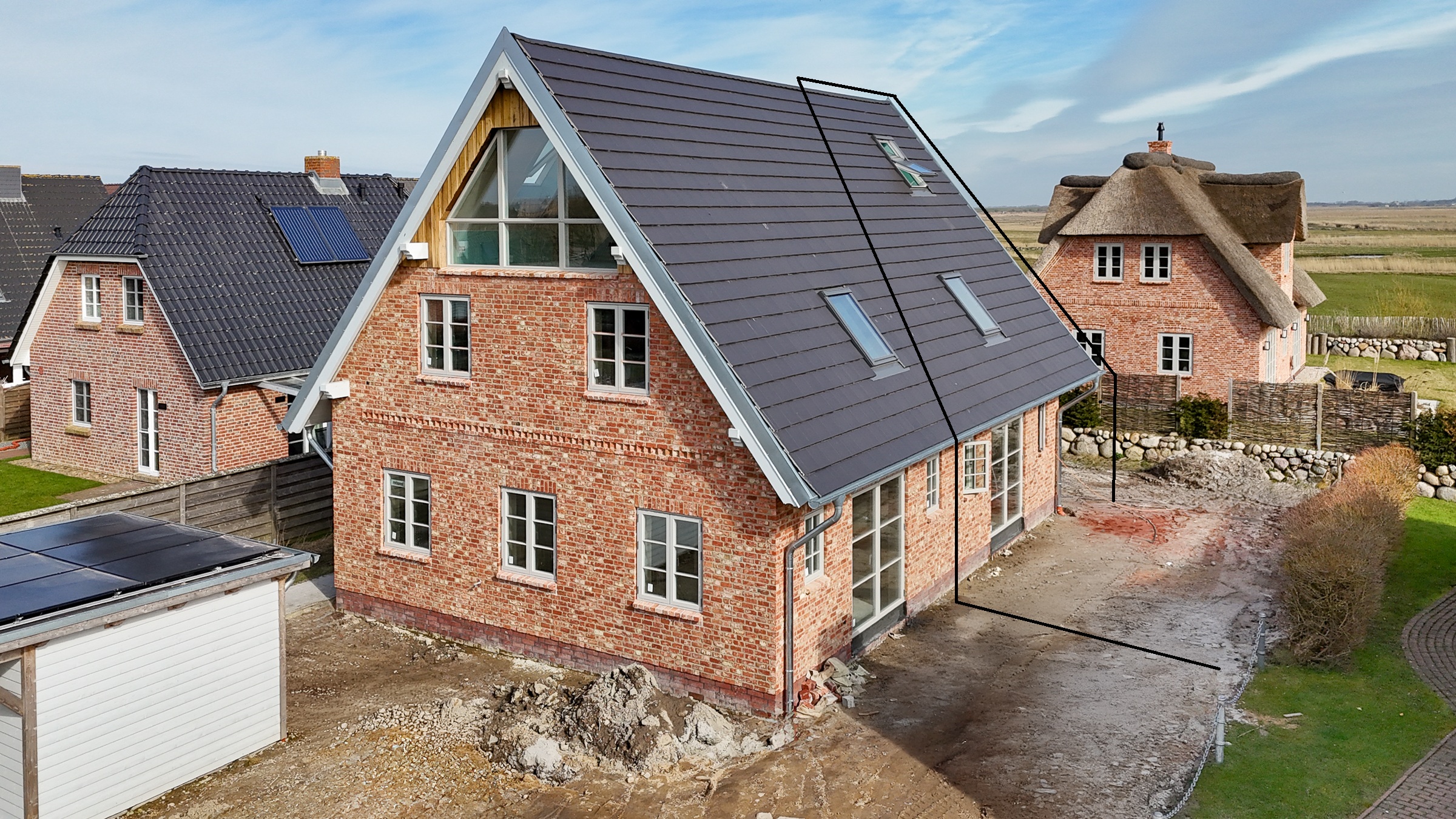 Das Haus steht auf einem ca. 501 m² großen Grundstück und bietet eine Wohnfläche von rund ca. 88 m². Die Architektur spiegelt die ortstypische Bauweise wider und wird durch einen charakteristischen Antikverblender geprägt, der dem Objekt eine besondere, hochwertige Ausstrahlung verleiht und sich harmonisch in die nordfriesische Umgebung einfügt. Im Erdgeschoss erwartet Sie ein durchdachtes Raumkonzept. Herzstück bildet der offene Wohn- und Essbereich mit integrierter Küchennische, der durch seine Helligkeit und Großzügigkeit überzeugt. Von hier aus schließt sich direkt die Terrasse an, wodurch eine fließende Erweiterung des Wohnraums nach draußen entsteht und ein harmonisches Zusammenspiel von Innen- und Außenbereich ermöglicht wird. Ergänzt wird diese Ebene durch ein Gäste-WC sowie einen Hauswirtschaftsraum mit moderner Erdwärmepumpe mit Tiefenbohrung, die für eine nachhaltige und effiziente Energieversorgung sorgt. Eine Fußbodenheizung gewährleistet dabei im gesamten Haus ein angenehmes Wohnklima. Das Obergeschoss beherbergt zwei gut geschnittene Schlafzimmer sowie ein großzügiges Badezimmer, das mit einer Eckbadewanne, einer bodenebenen Dusche, integrierter Sauna sowie hochwertigen Axor Armaturen von Hansgrohe in Schwarz matt ausgestattet ist – ein besonderer Rückzugsort für entspannte Stunden. Zusätzlichen Stauraum sowie weitere Nutzungsmöglichkeiten bietet der Spitzboden, der flexibel gestaltet werden kann. Ein eigener Stellplatz rundet das Angebot ab. Der Außenbereich überzeugt durch einen angelegten Garten mit Terrasse aus hochwertigen Krustenplatten, die sich stimmig in die natürliche Umgebung einfügen.