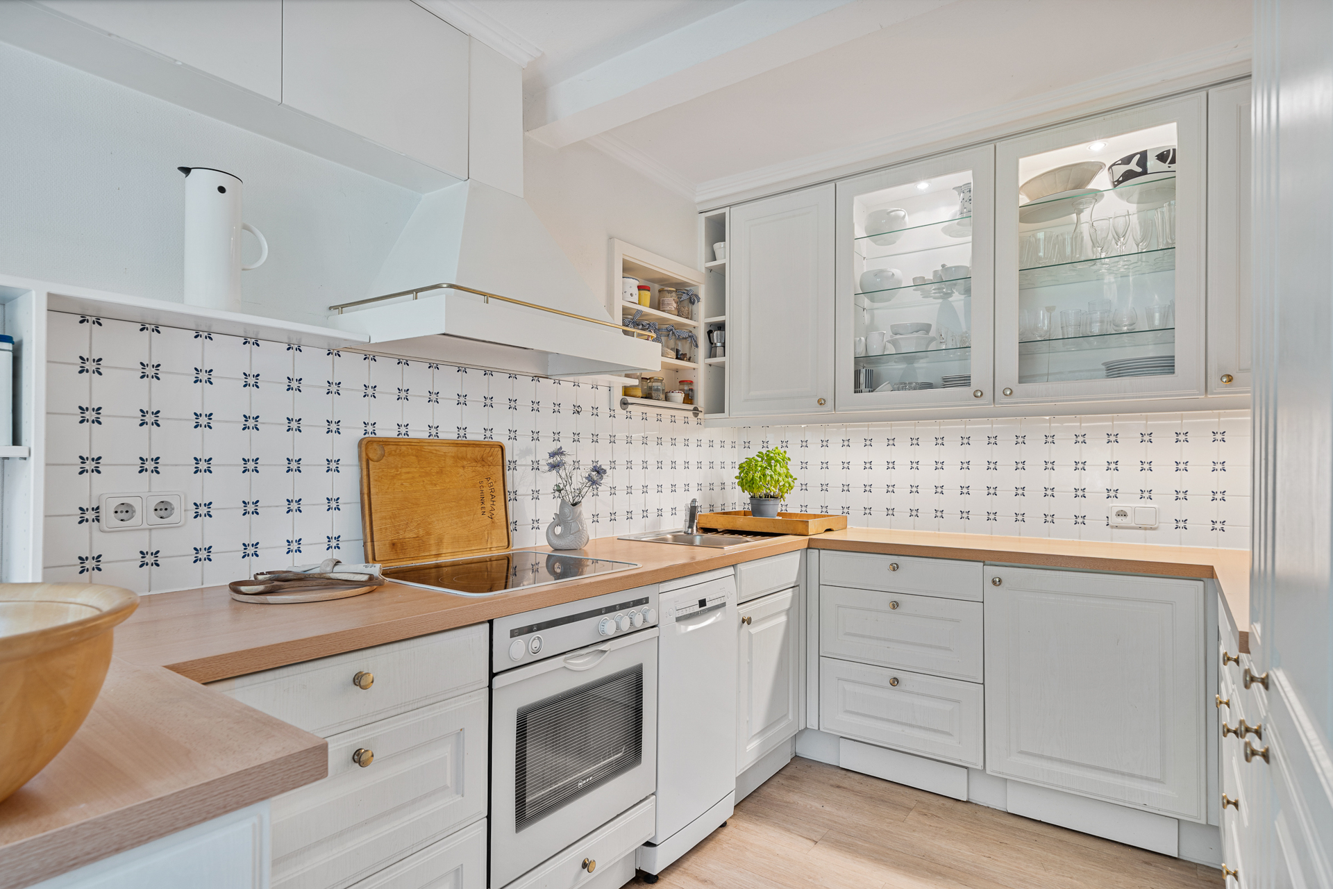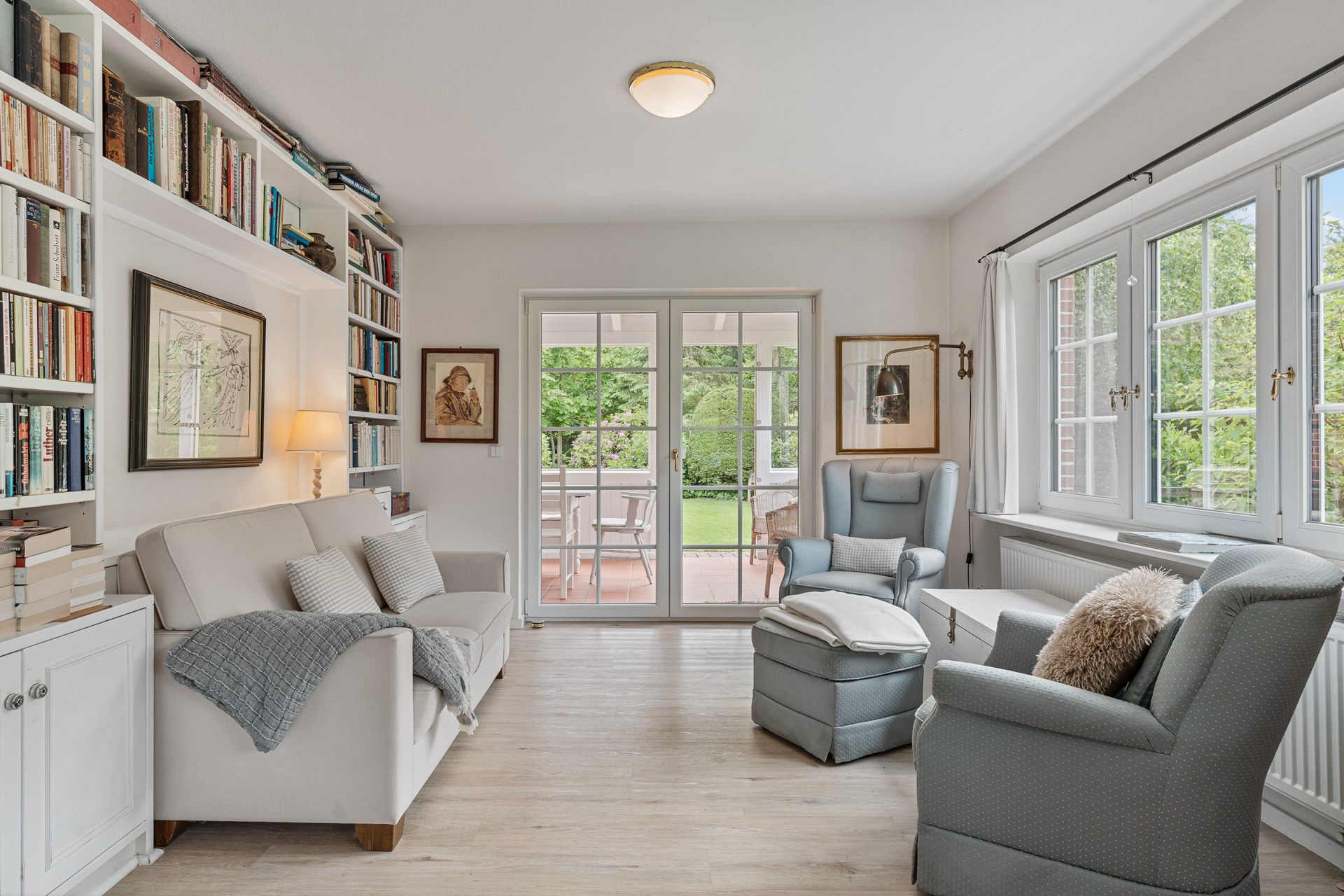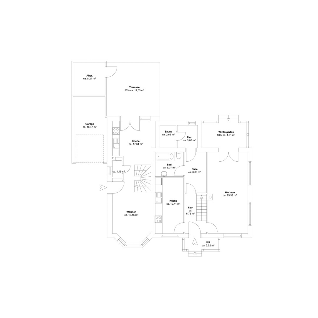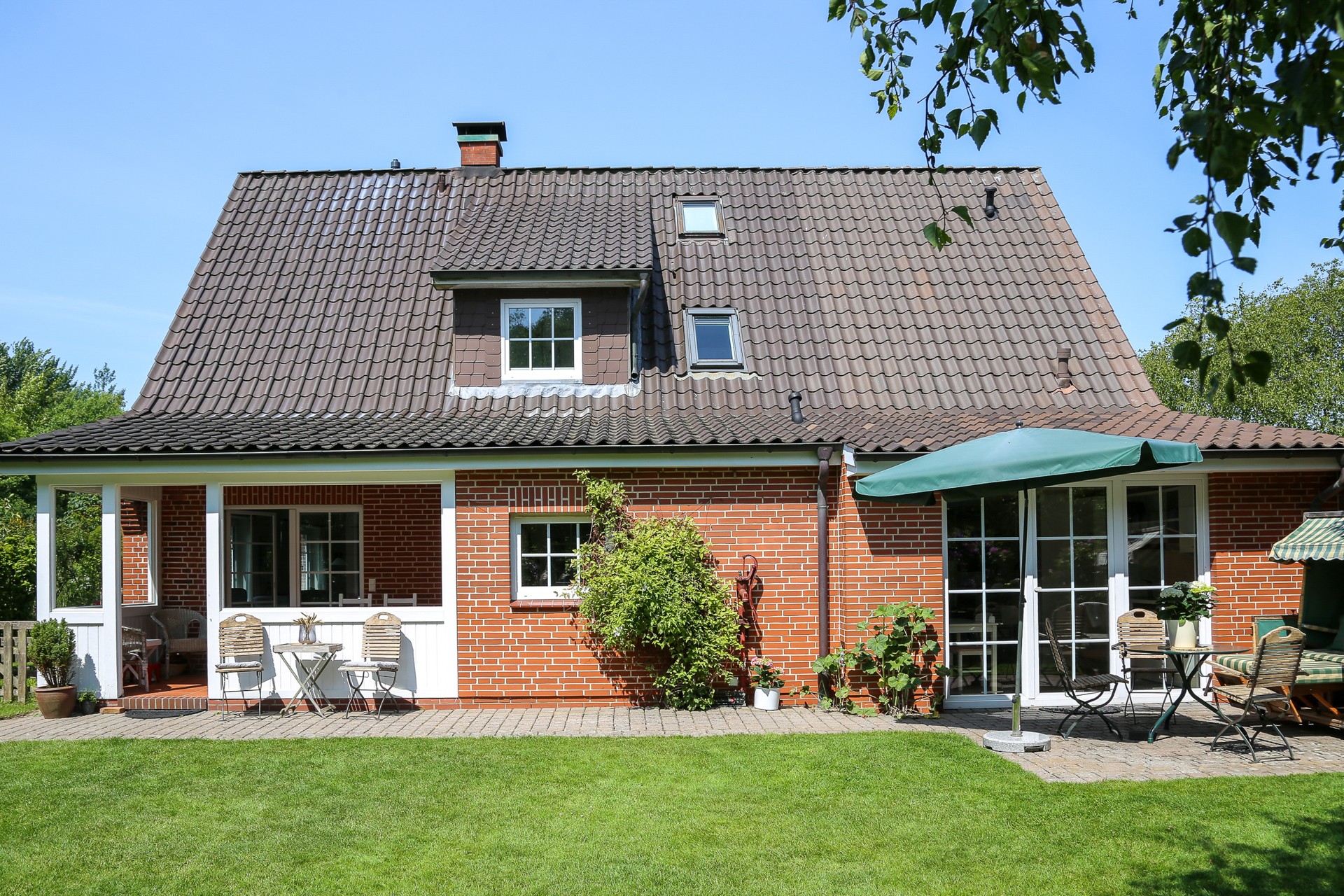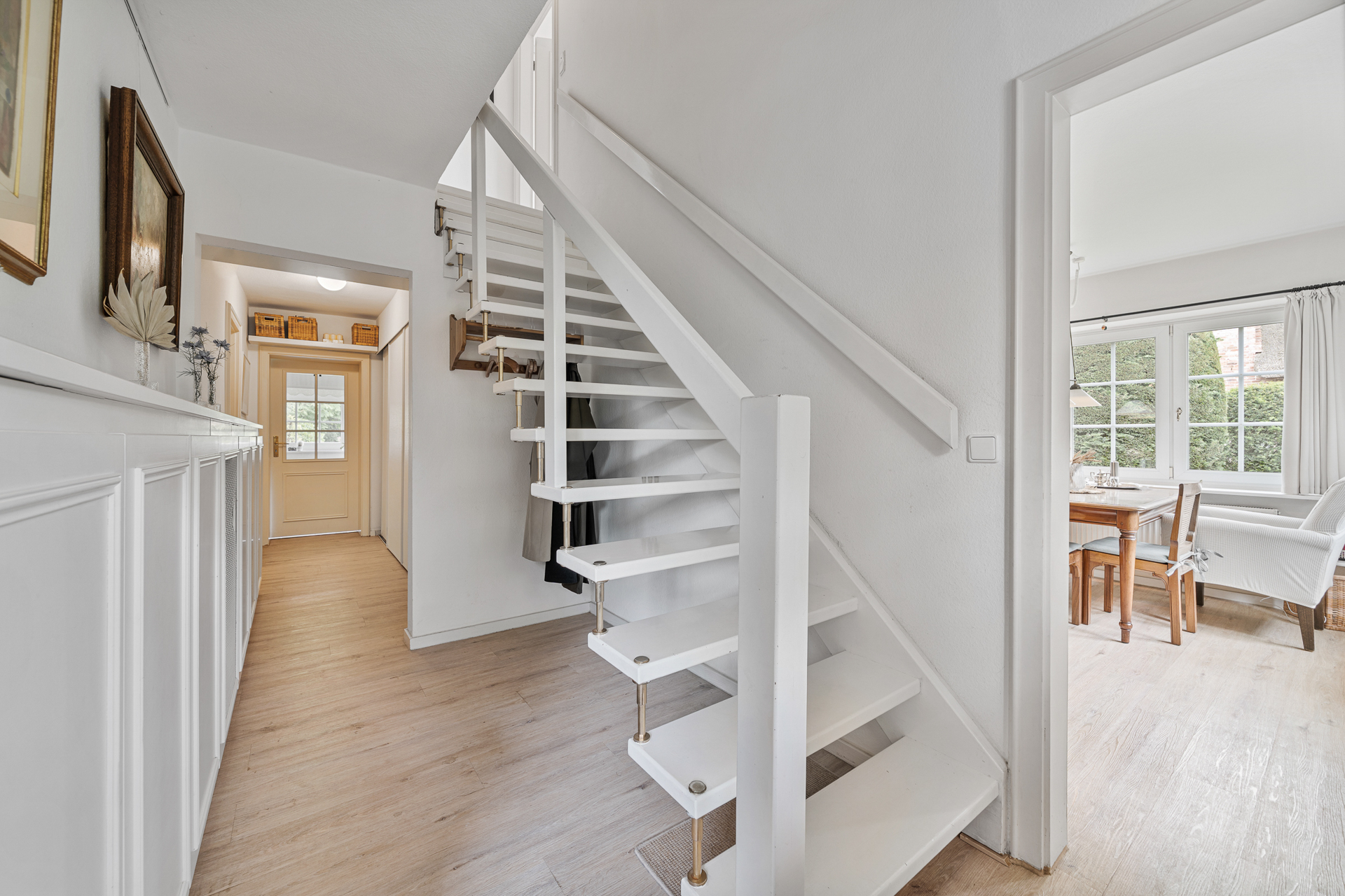 Einladend betreten Sie das Haus über eine kleine, überdachte Veranda. Der Flur öffnet sich rechts zum stilvollen Wohn- und Essbereich mit direktem Zugang zur großen, überdachten Gartenveranda - ein lichtdurchfluteter Lieblingsplatz, der zu jeder Tages- und Jahreszeit nutzbar ist. Die großzügige Fensterfront verbindet Innen- und Außenraum auf harmonische Weise.