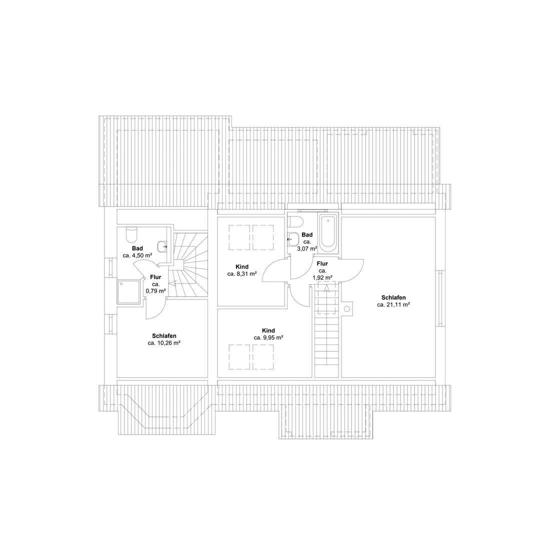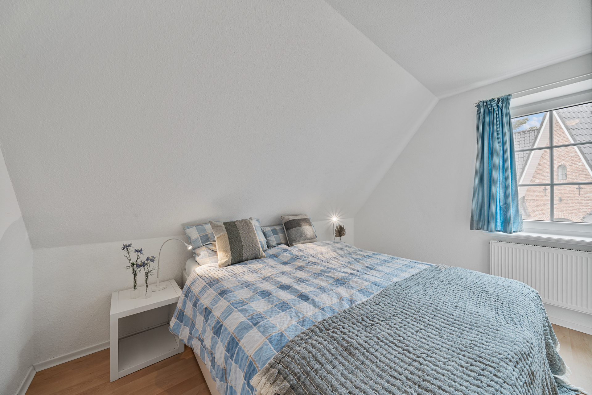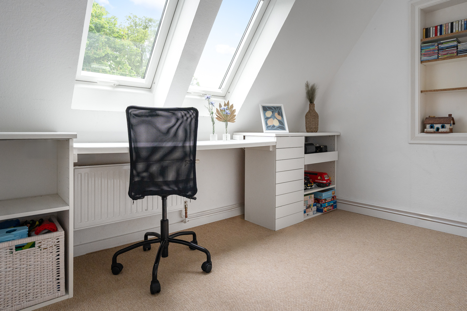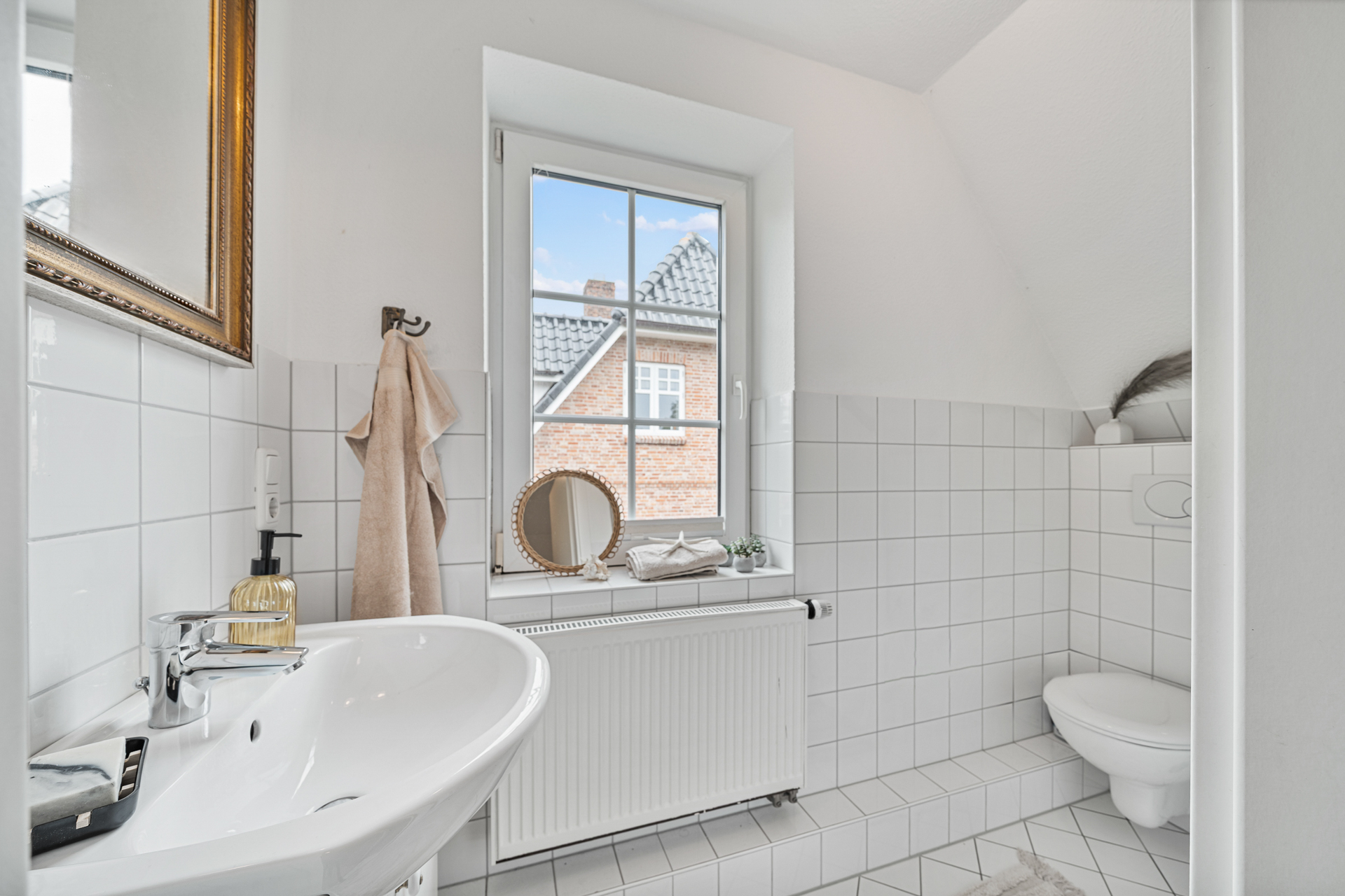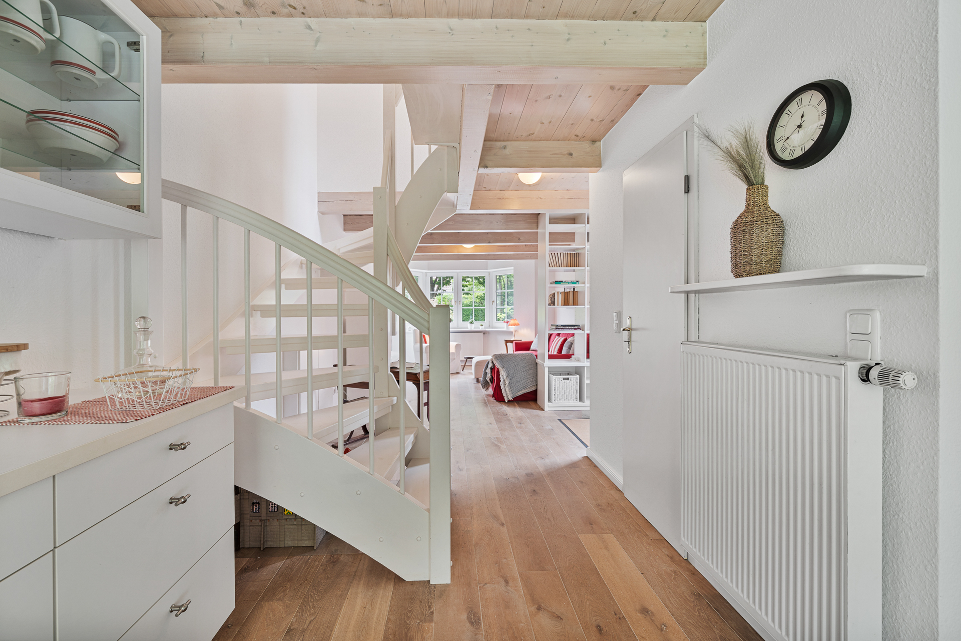 Zur linken Seite des Eingangsbereichs führt eine Holzschiebetür mit Glaselementen in die helle Küche samt gemütlicher Sitzecke. Ebenfalls im Erdgeschoss befinden sich ein Badezimmer mit großer Eckbadewanne sowie ein weiterer Raum, der aktuell als Saunabereich genutzt wird. Eine offene Holztreppe führt ins Obergeschoss. Dort bieten drei Schlafzimmer und ein zusätzliches kleines Badezimmer vielseitige Nutzungsmöglichkeiten - für Familien, Gäste oder ein separates Homeoffice.