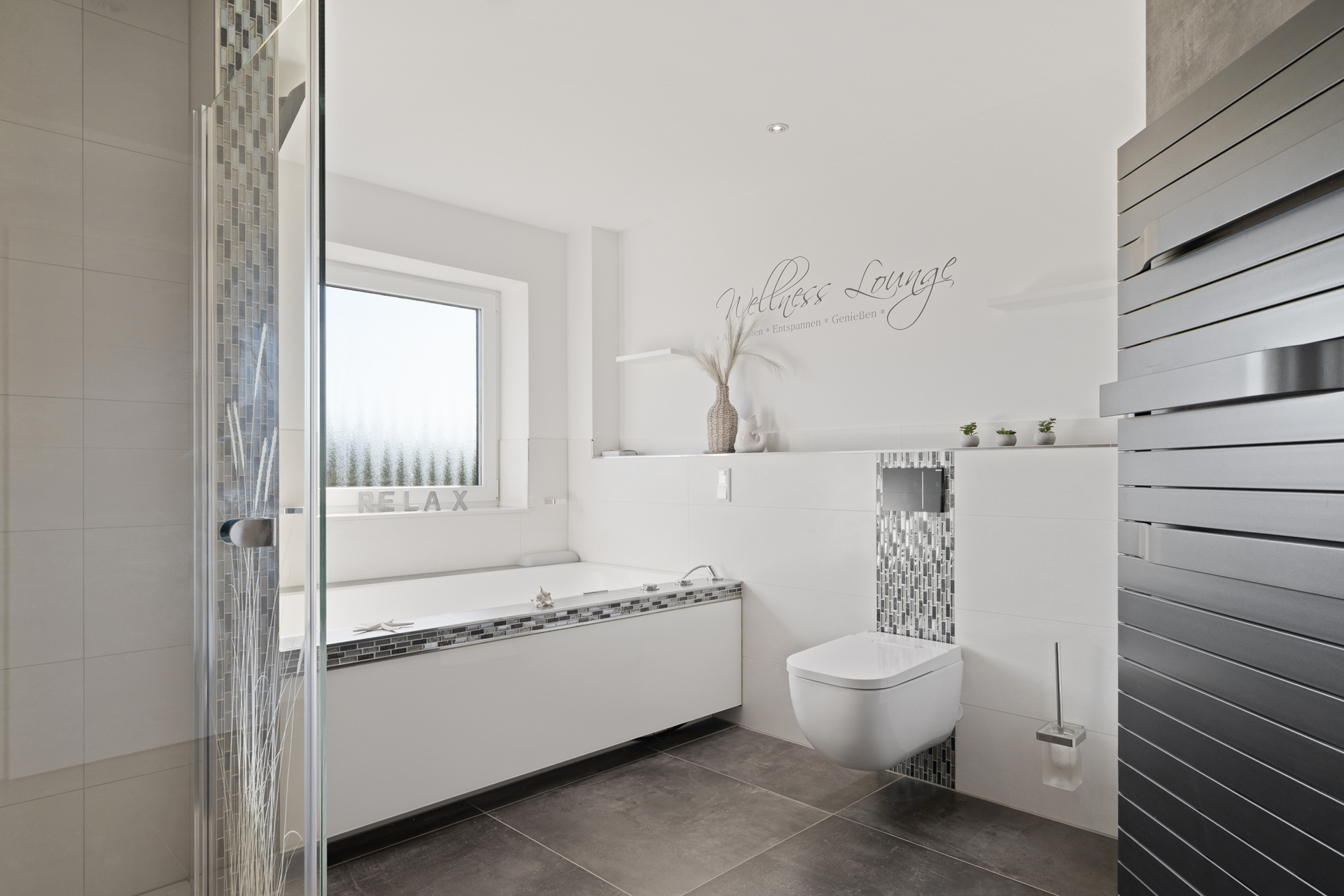 Das luxuriöse Masterbad setzt neue Maßstäbe in Sachen Wellness und Komfort: Die großzügige Badewanne ist mit Whirlpool-Funktion, Soundsystem und beleuchteter Wannenfront ausgestattet. Die Dusche bietet eine Regendusche mit Wasserfall, Seitendüsen, Vorwärmfunktion sowie eine beleuchtete Duschkabine. Ein Dusch-WC mit integrierter Bidetfunktion sowie hochwertige Badmöbel runden das edle Ambiente ab.