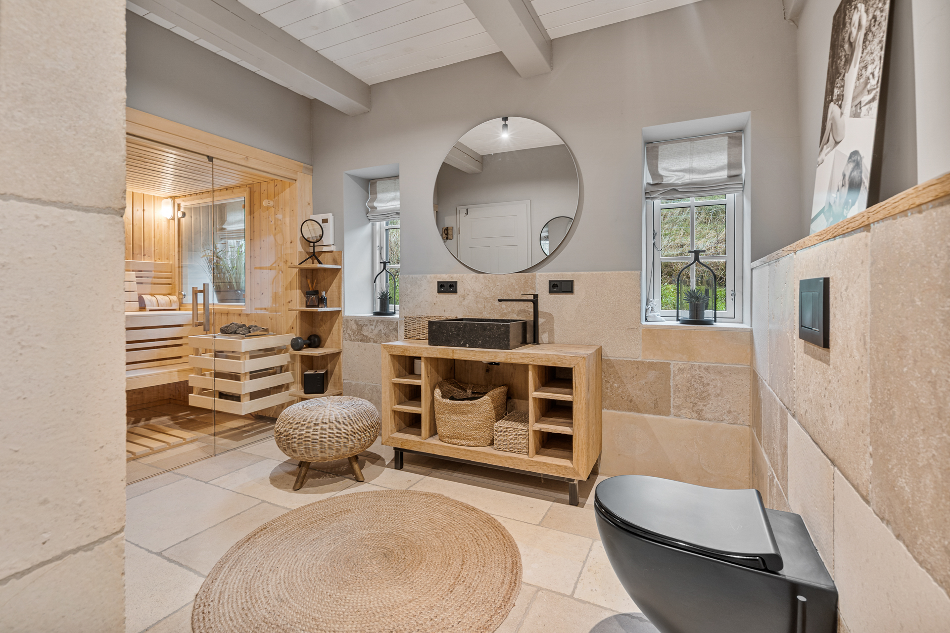 Im Erdgeschoss befinden sich zudem ein praktischer Abstellraum, der alternativ auch als weiteres Badezimmer genutzt werden kann, da sämtliche Anschlüsse bereits vorhanden sind, ein großzügiges Badezimmer mit Regendusche und integrierter Sauna, ein Hauswirtschaftsraum sowie ein ebenerdiges Schlafzimmer, das sich ideal auch für altersgerechtes Wohnen eignet.