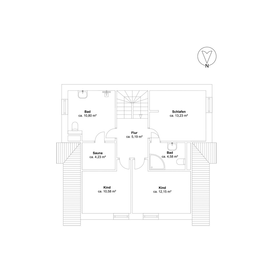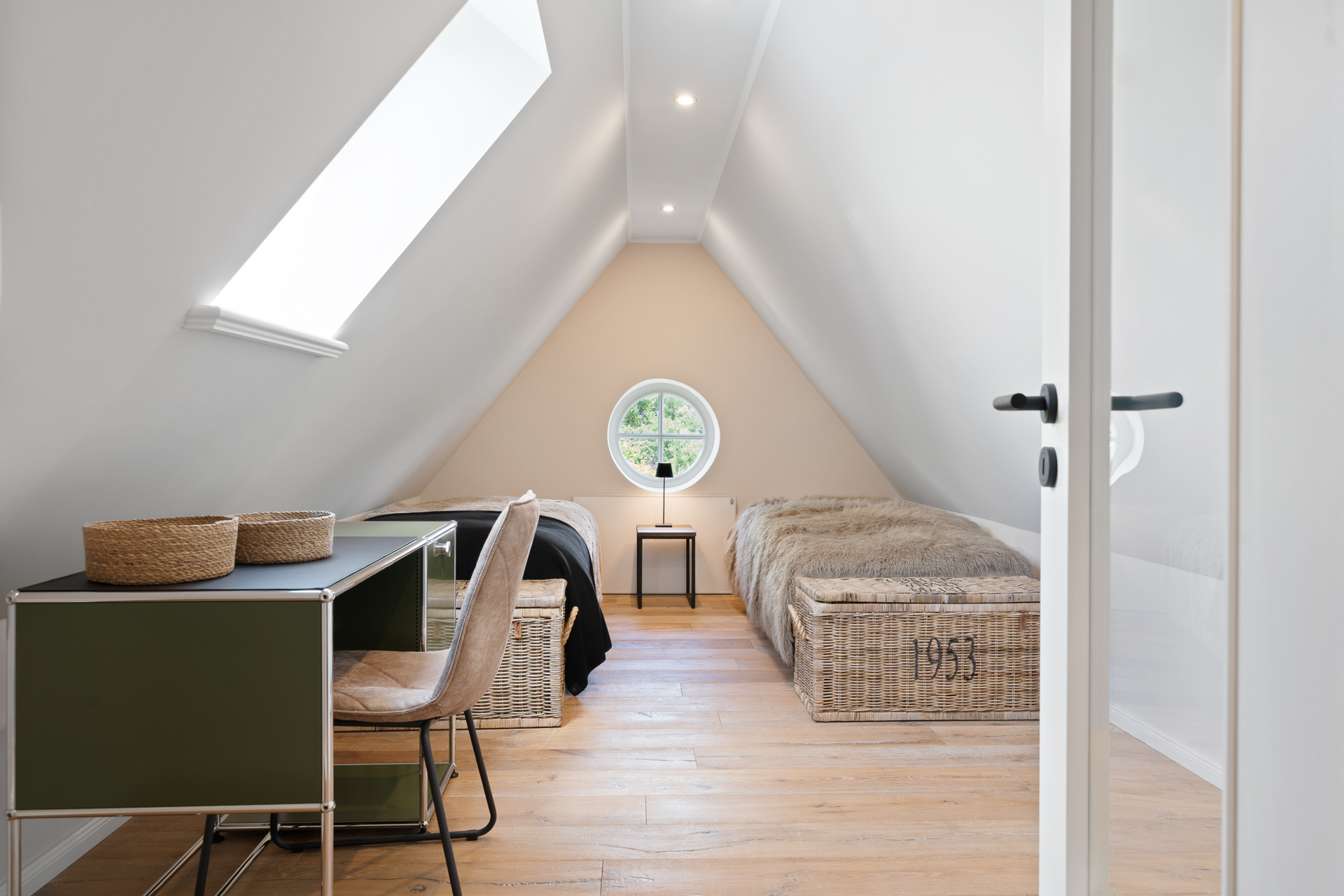 Eine offen gestaltete Eichenholztreppe führt in den wohnlich ausgebauten Spitzboden, der vielfältige Nutzungsmöglichkeiten bietet - sei es als Arbeitszimmer, Hobbyraum oder zusätzlicher Rückzugsort.