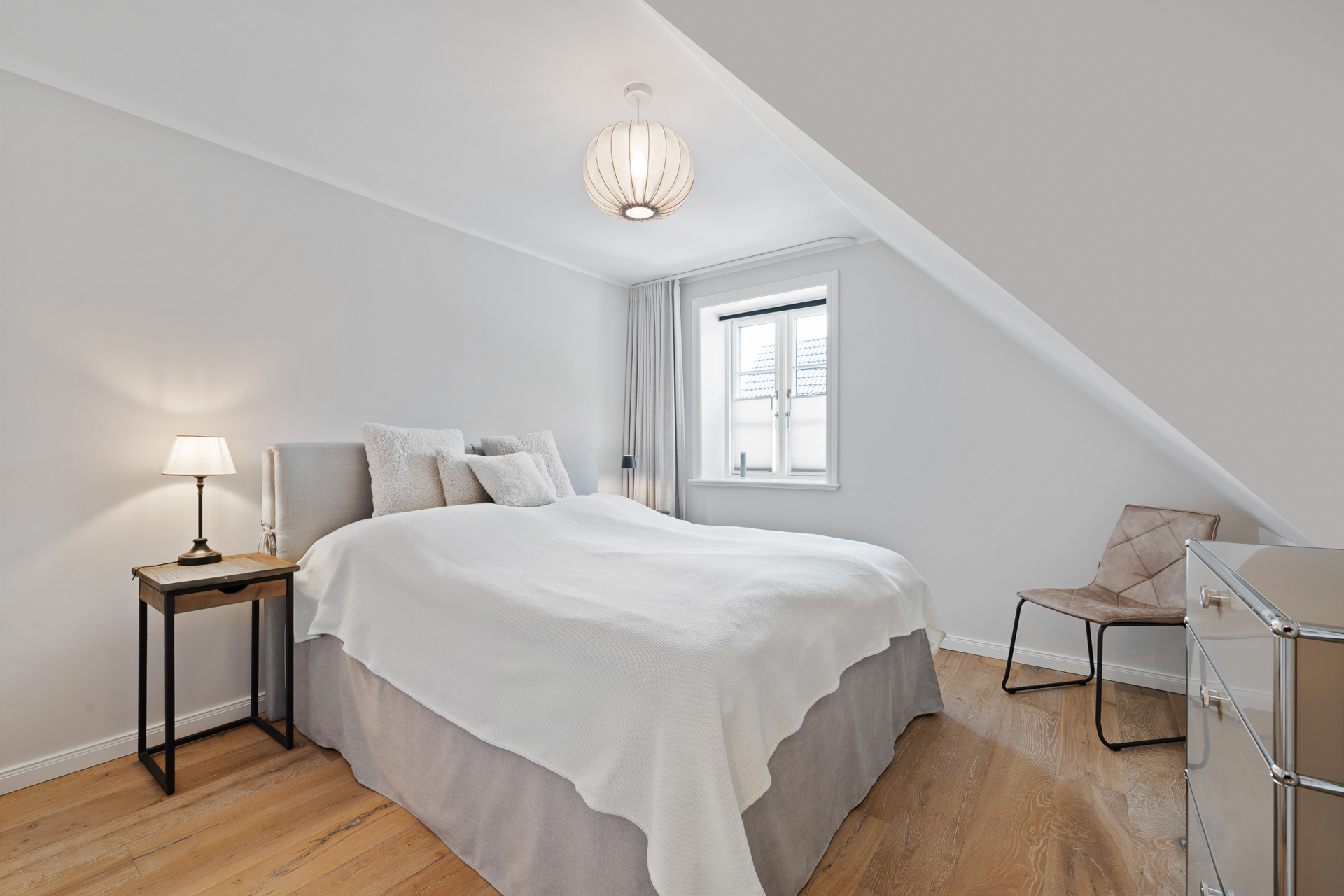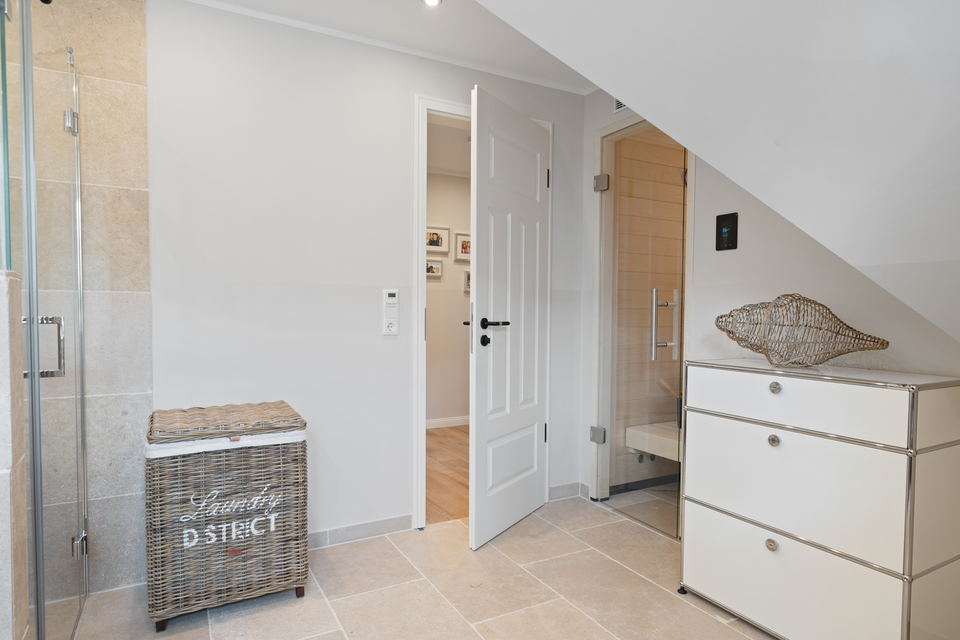 Das Obergeschoss beherbergt insgesamt drei gut geschnittene Zimmer, darunter ein großzügiges Schlafzimmer mit Badezimmer en Suite sowie zwei weitere Schlafzimmer. Ein zusätzliches Bad mit integrierter Sauna sorgt für besonderen Komfort und Wellness zu Hause.