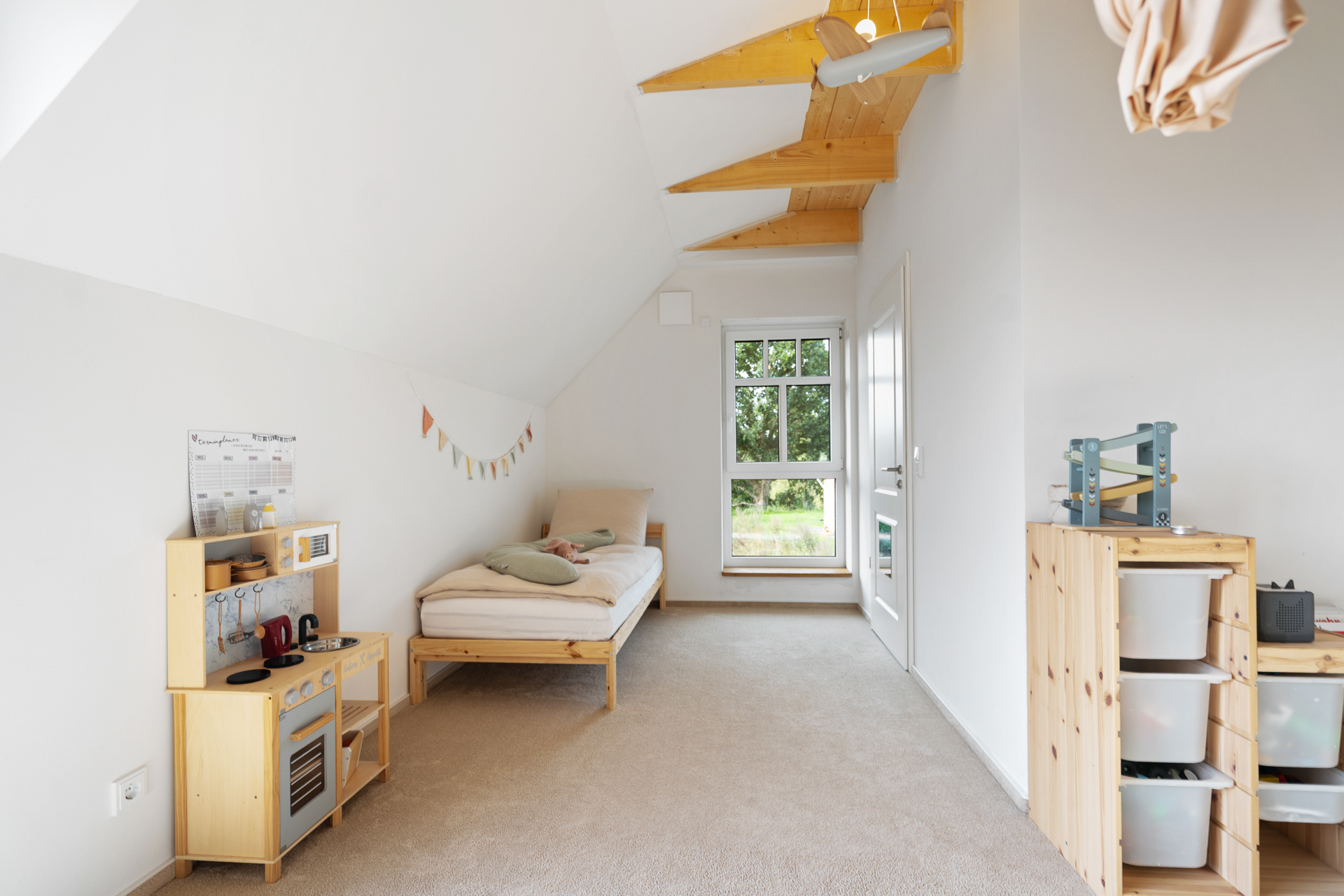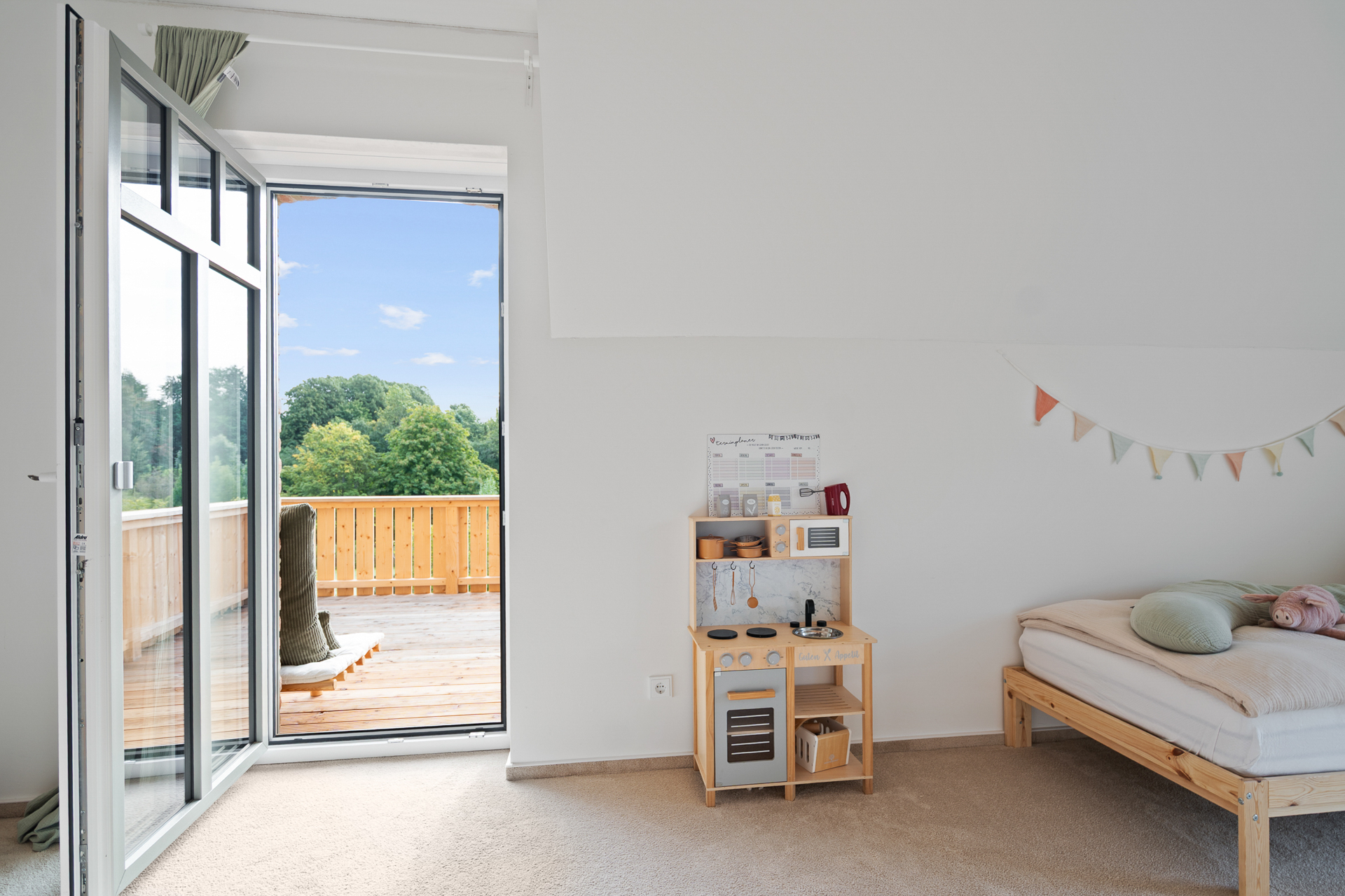 Über eine geschwungene Echtholz-Betontreppe mit massiven Eichenstufen gelangen Sie ins Obergeschoss. Die offene Galerie mit maßgefertigtem Glasgeländer verbindet die Ebenen elegant und unterstreicht das luftige Raumkonzept. Hier befinden sich zwei helle Kinderzimmer, von denen eines Zugang zum Balkon mit warmen Holzdielen und unverbaubarem Blick über die idyllischen Teiche bietet. Das separate Kinderbad ist funktional und hochwertig ausgestattet. Das Elternschlafzimmer verfügt ebenfalls über einen direkten Zugang zum Balkon und lädt mit seinem freien Blick ins Grüne zum Verweilen ein. Das angeschlossene Bad en Suite überzeugt mit moderner Steinoptik, einer bodengleichen Dusche mit integrierter Sitzbank sowie einer stilvoll eingelassenen Badewanne. Tageslicht fällt durch das Dachflächenfenster und schafft in Kombination mit der sichtbaren Holzdecke eine besonders wohnliche Atmosphäre. Ein großzügiger Dachboden rundet das Raumangebot ab und bietet vielseitige Nutzungsmöglichkeiten - ob als Stauraum oder für einen späteren Ausbau.