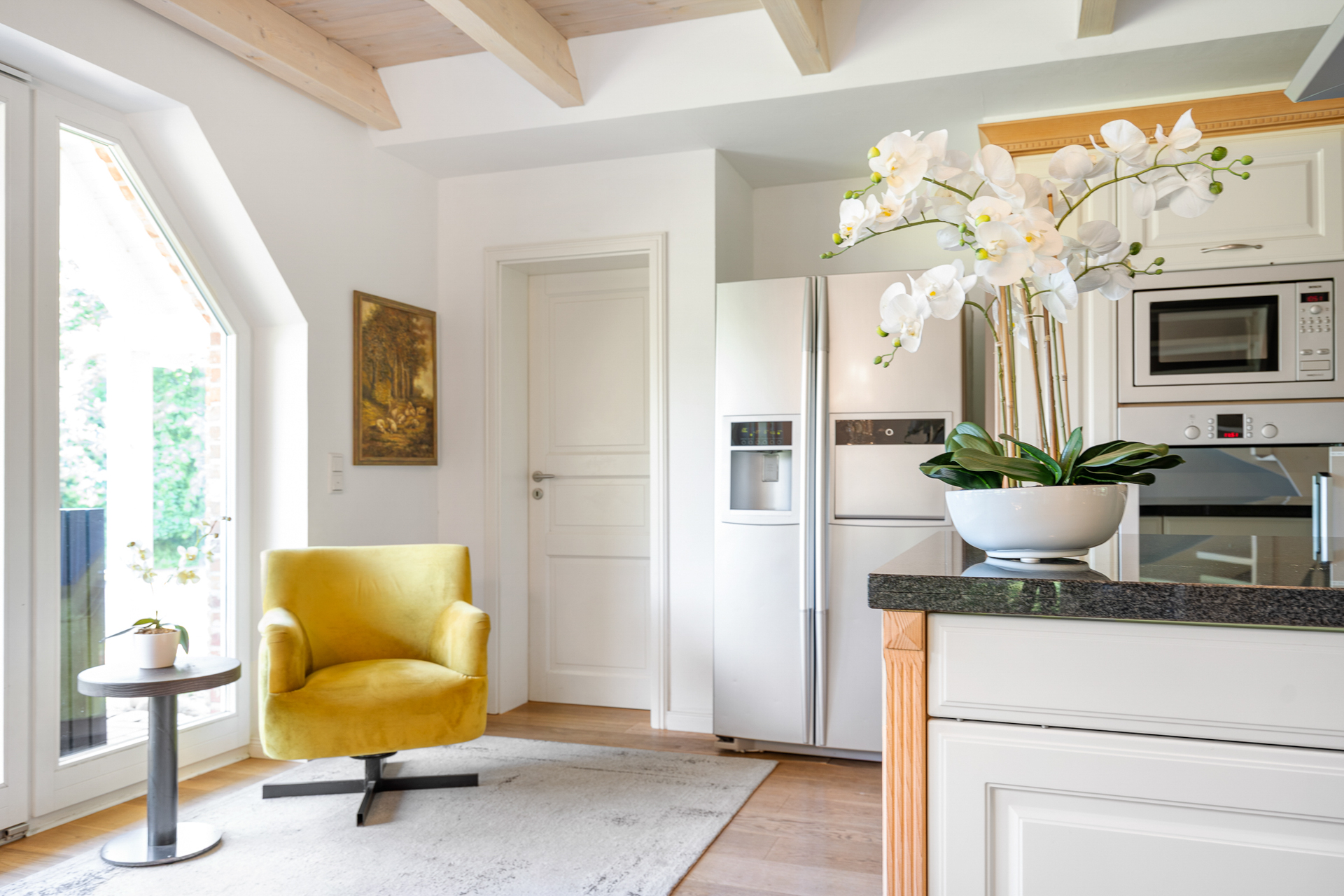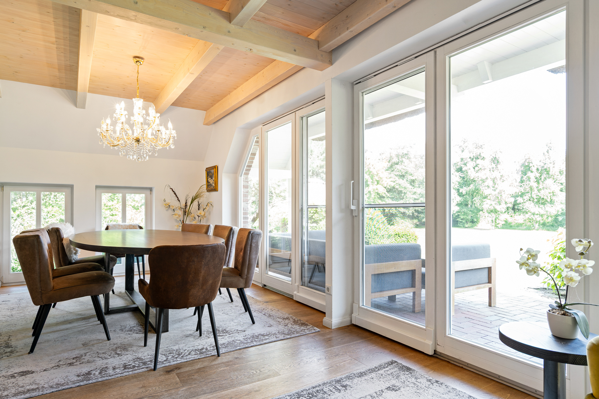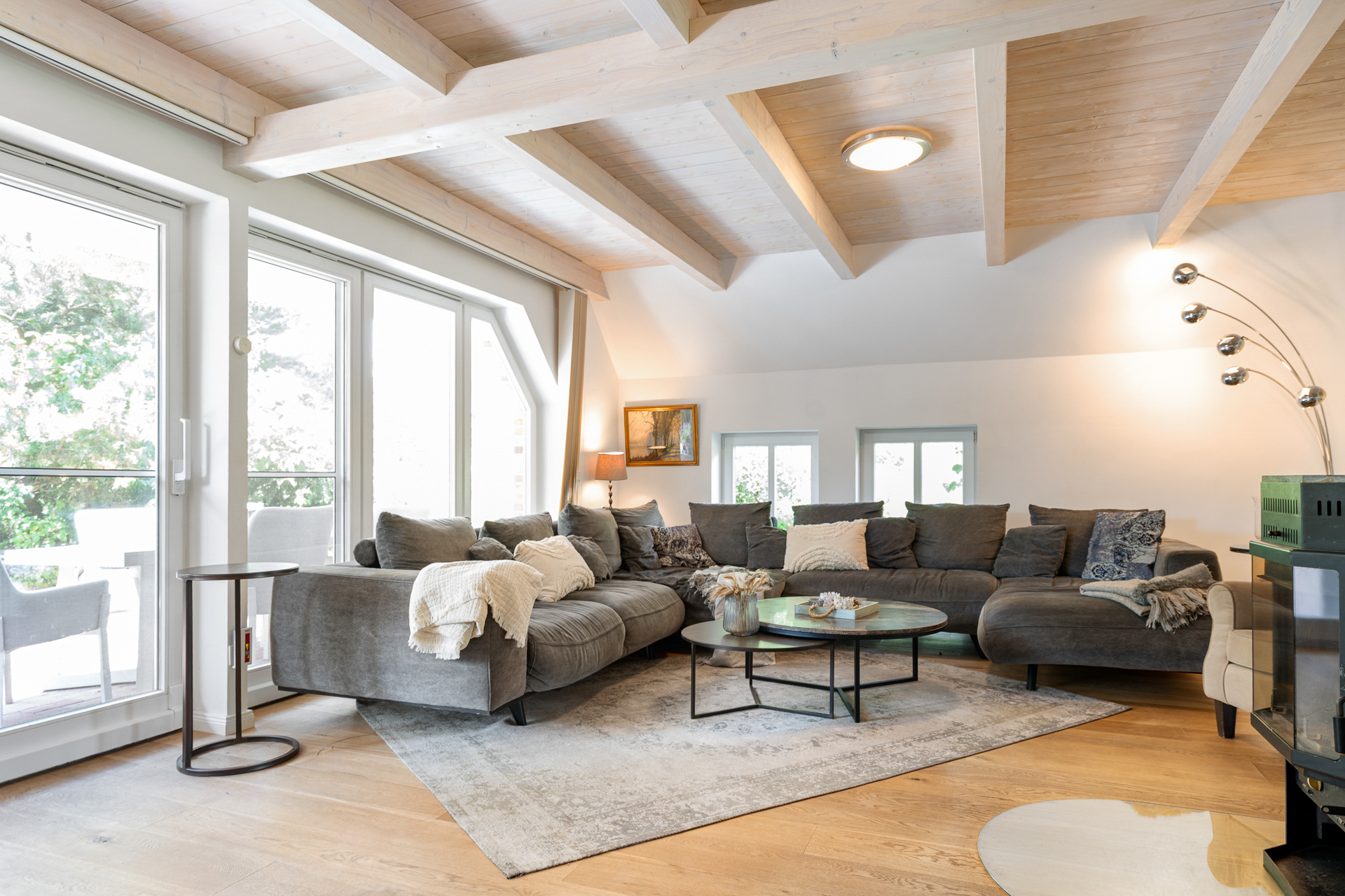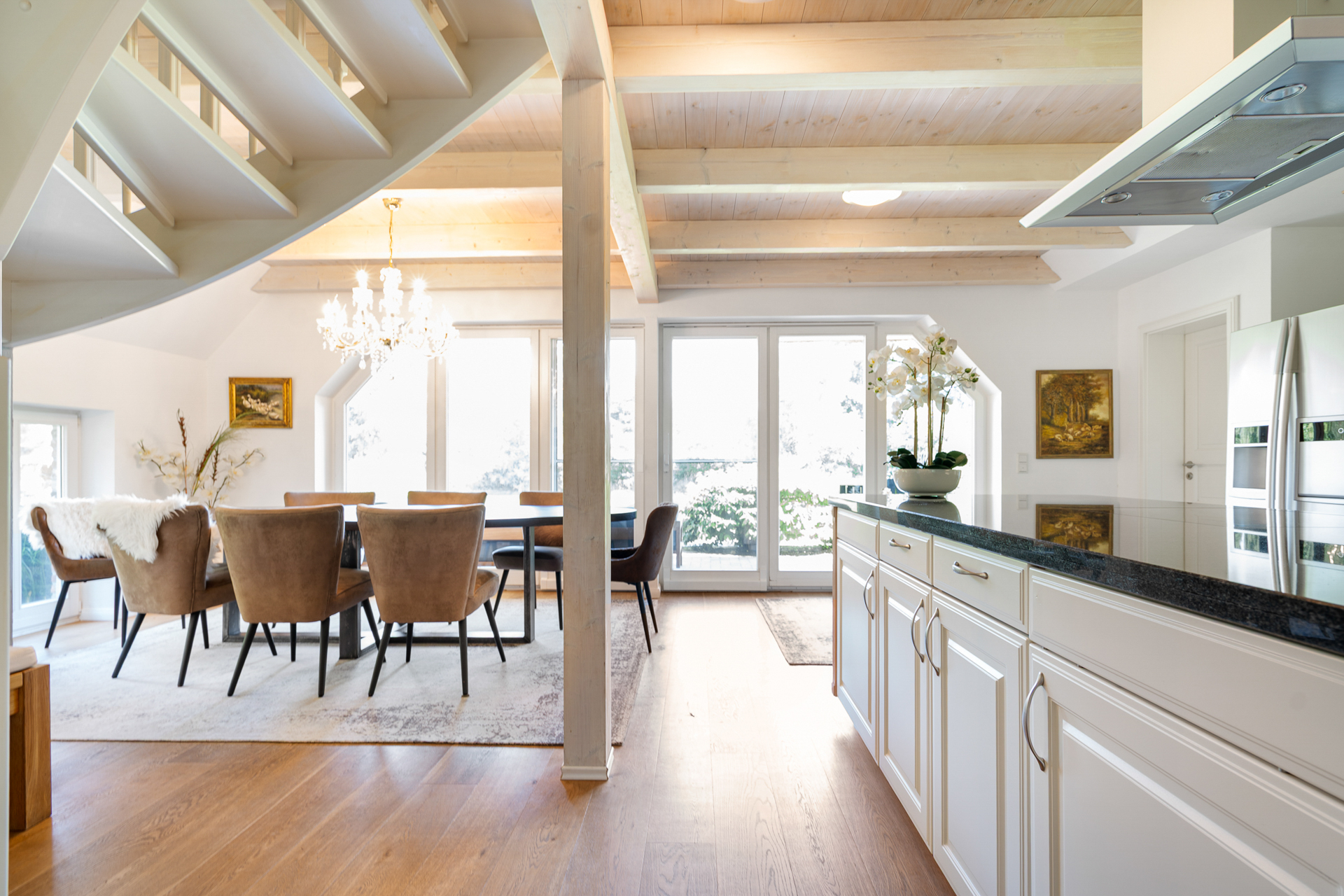 Schon beim Eintreten empfängt Sie ein Wohngefühl, das Geborgenheit und Großzügigkeit auf besondere Weise vereint. Die Kombination aus offener Holzbalkendecke, edlen Eichenholzböden und warmen Farbtönen schafft eine stimmige, natürliche Wohnatmosphäre. Licht durchflutet die Räume, der Blick gleitet durch große Fensterachsen ins Grüne und überall spürt man die Liebe zum Detail.
