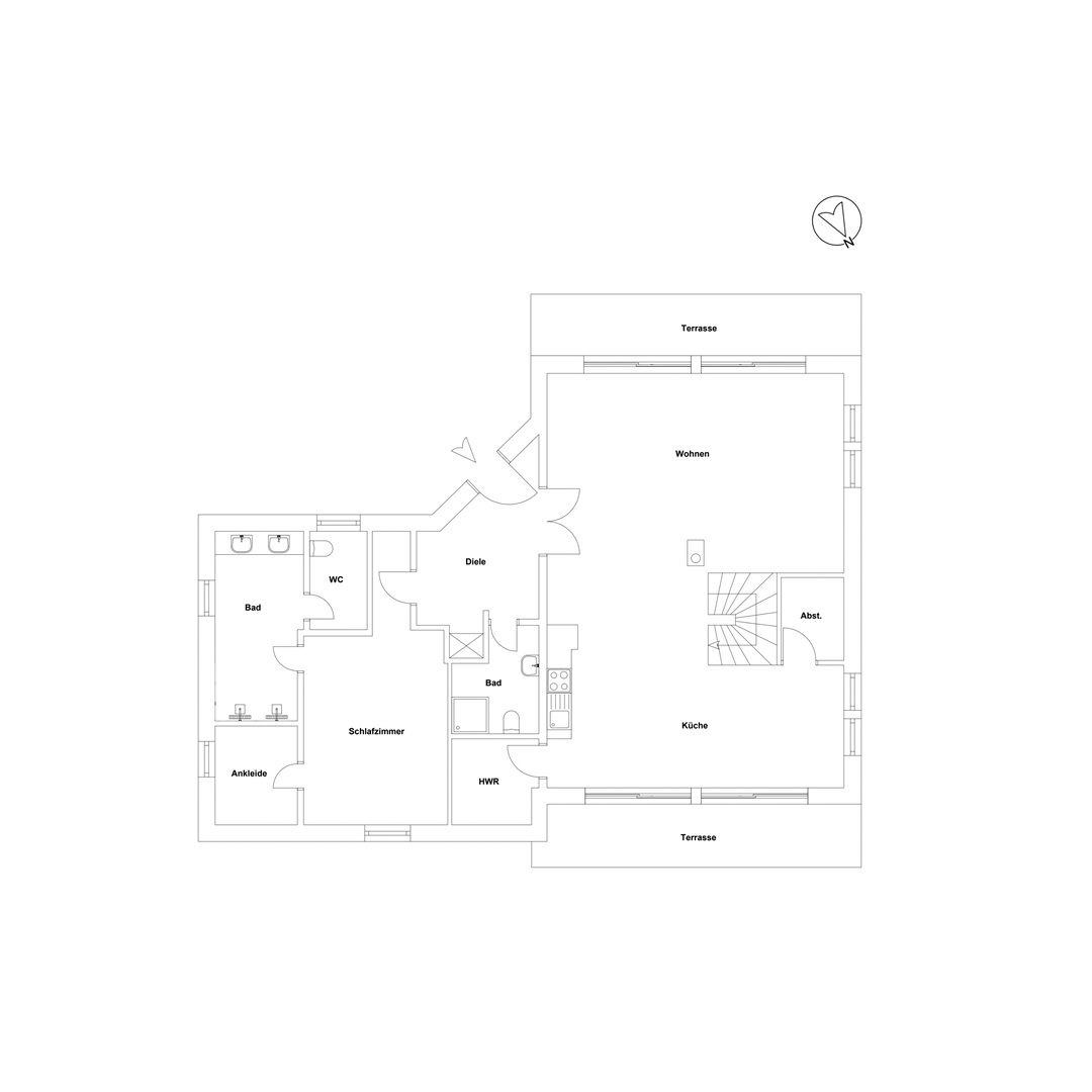 Im Erdgeschoss erwartet Sie ein offener Wohn-, Ess- und Küchenbereich mit fließenden Übergängen, einladender Helligkeit und viel Raum für gemeinsames Leben. Eine beinahe eigenständige Einheit ergänzt diese Ebene: ein Schlafzimmer mit angrenzendem, großzügigem Badezimmer, ausgestattet mit einer Regenfall-Doppeldusche, separatem WC und Ankleideraum. Ein zusätzliches Badezimmer sorgt für weiteren Komfort.