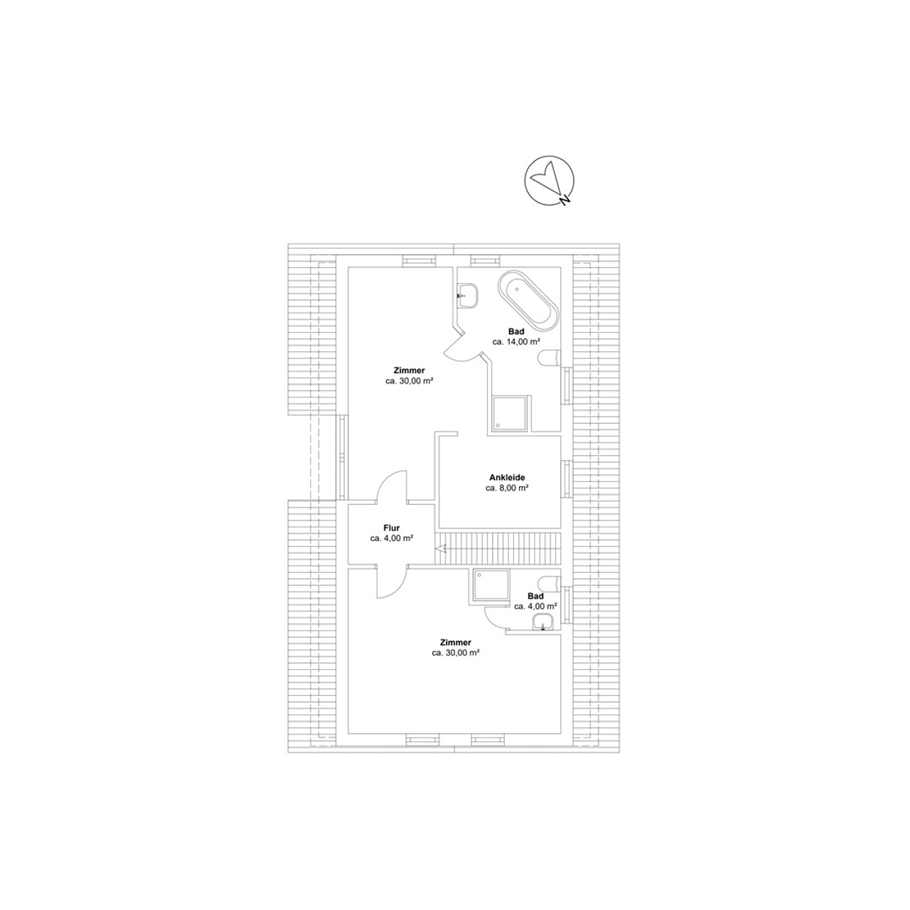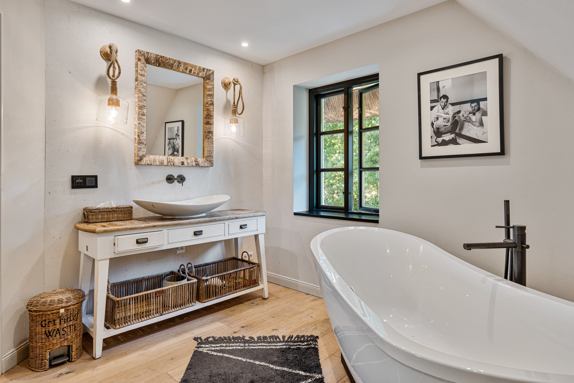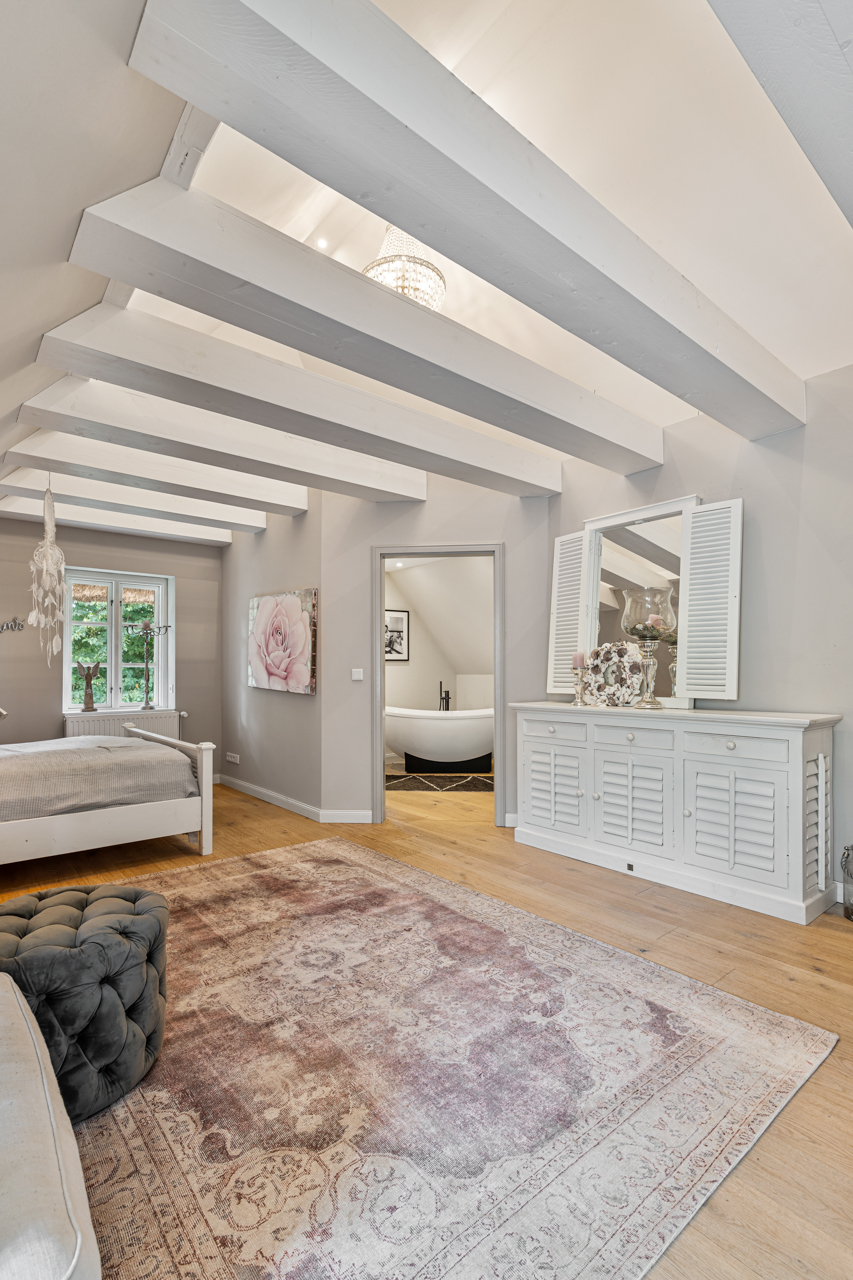 Über einen separaten, dennoch innerhalb des Hauses zugänglichen Eingang gelangen Sie in das Obergeschoss. Hier erwarten Sie zwei weitere, luxuriöse Schlafzimmer, jeweils mit eigenem Badezimmer. Besonders hervorzuheben ist das große Schlafzimmer mit offener Balkenlage, einem begehbaren Kleiderschrank und einem großzügigen Badezimmer, das mit einer freistehenden Badewanne ein echtes Highlight darstellt.