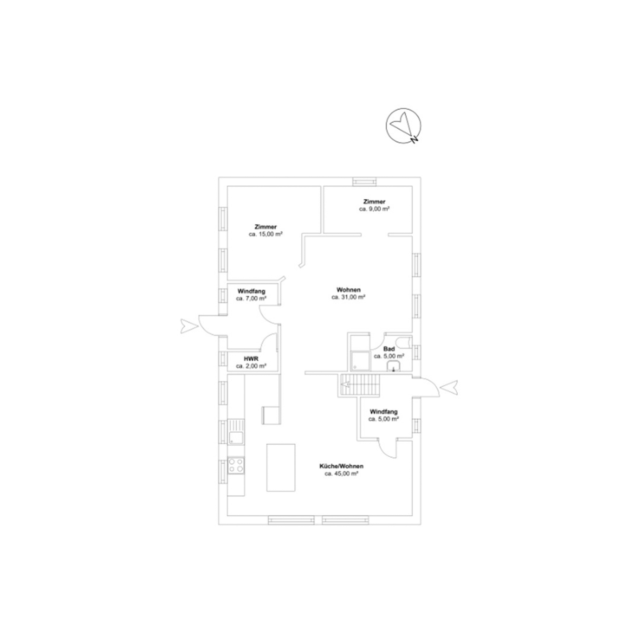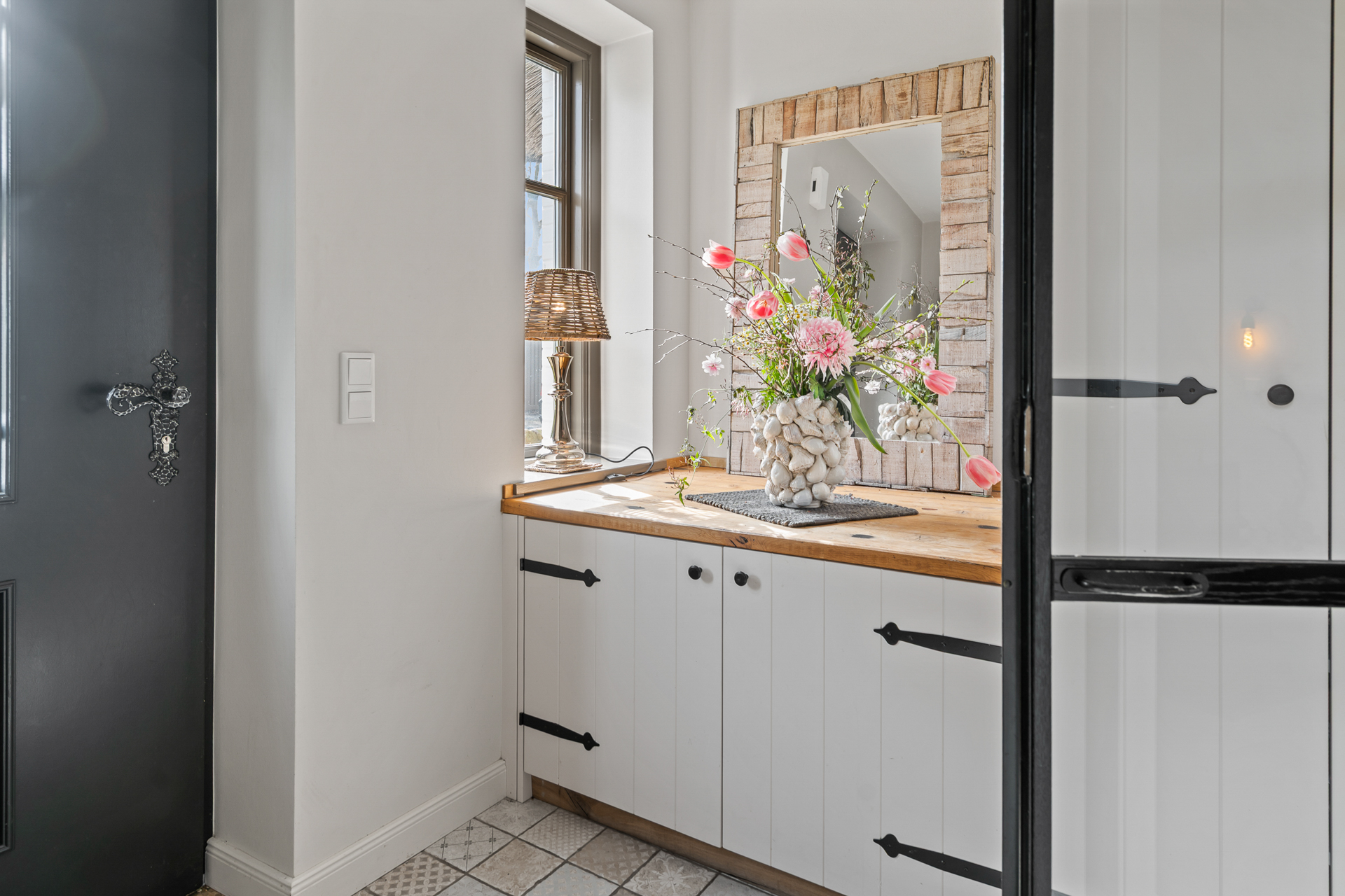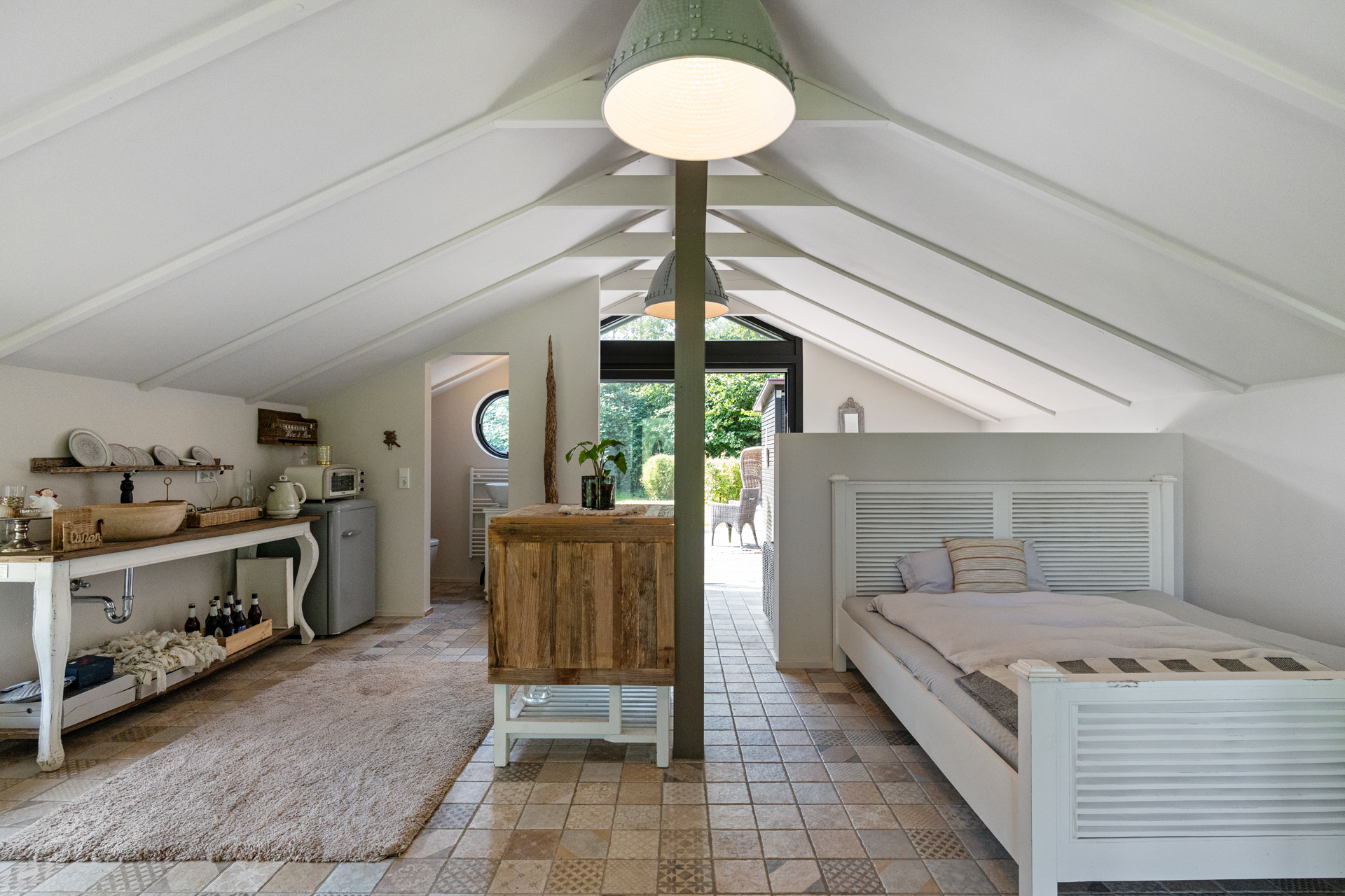 Die Küche, das Herzstück des Hauses, lässt keine kulinarischen Wünsche offen. Sie beeindruckt durch ihre exklusive Landhausoptik und die Rundbogenfenster, die einen atemberaubenden Blick in den liebevoll angelegten Garten ermöglichen. Die Fenster lassen sich vollständig öffnen und verbinden so Innen- und Außenbereich auf harmonische Weise.