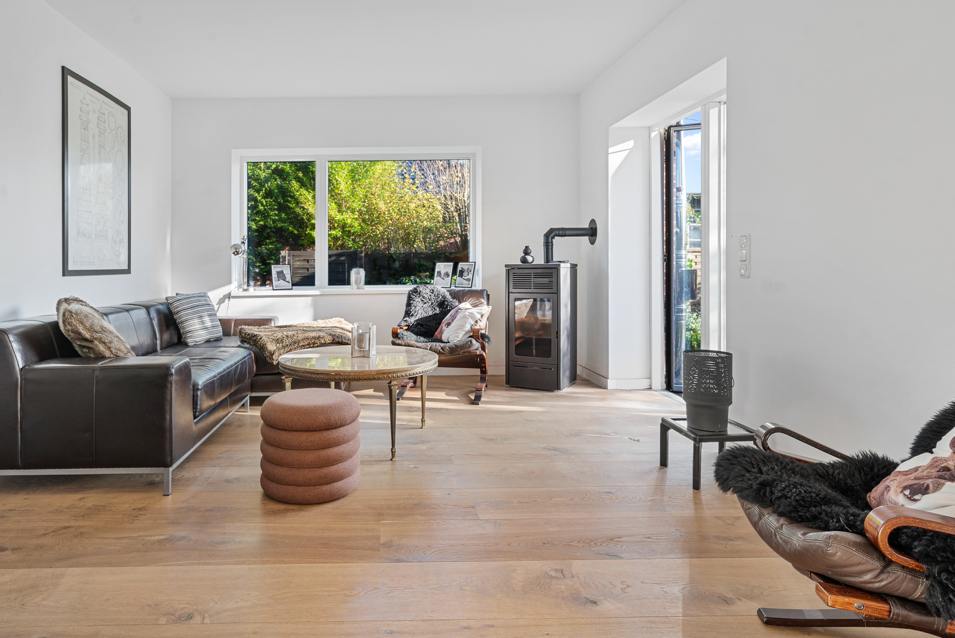 Im Erdgeschoss bildet der offen gestaltete Wohn-, Ess- und Kochbereich das Herzstück des Hauses. Die moderne Wohnküche überzeugt mit ruhigen, zeitgemäßen Fronten und warmen Holzoberflächen, während das angrenzende Wohnzimmer mit seiner klaren Gestaltung und dem Pelletofen eine angenehme, wohnliche Atmosphäre schafft. Beide Bereiche stehen in direktem Bezug zueinander und wirken durch ihre abgestimmte Material- und Formensprache harmonisch verbunden. Großzügige Fensterflächen und die bodentiefe Terrassentür öffnen den gesamten Wohnbereich zum eingewachsenen Garten. Sie lassen viel Tageslicht herein, schaffen eine leichte, freundliche Raumwirkung und ermöglichen den direkten Übergang auf die angrenzende Holzterrasse, wo Innenraum und Natur auf natürliche Weise ineinander übergehen und sich ein entspannter Wohncharakter entfaltet. Das Schlafzimmer im Erdgeschoss wirkt hell und angenehm ruhig. Die dezente Podestlösung setzt innerhalb des Raumes einen feinen architektonischen Akzent und verleiht ihm eine leichte räumliche Staffelung. Direkt angrenzend befindet sich das Bad en suite, das mit einer großzügigen Walk-in-Dusche, hochwertigen Oberflächen und einer modernen, klaren Gestaltung überzeugt.