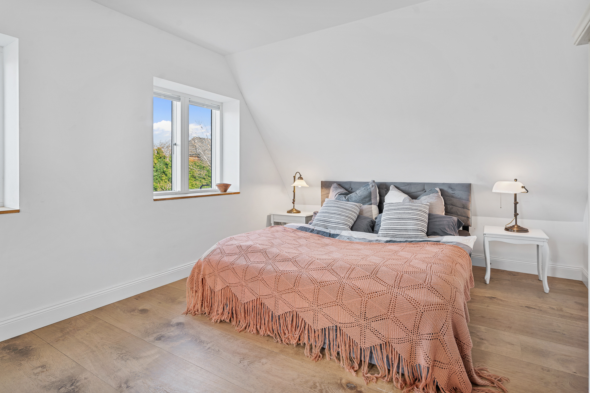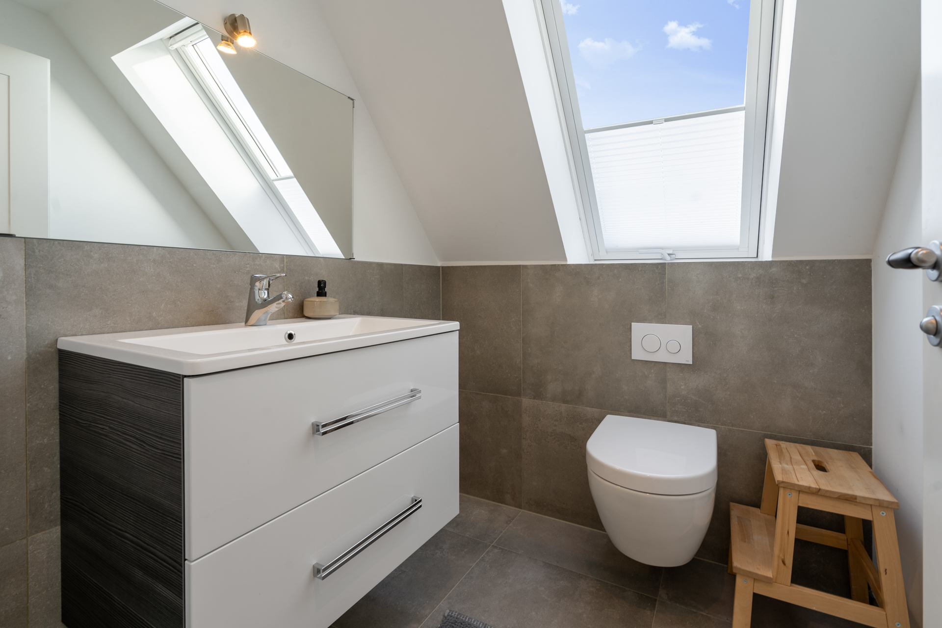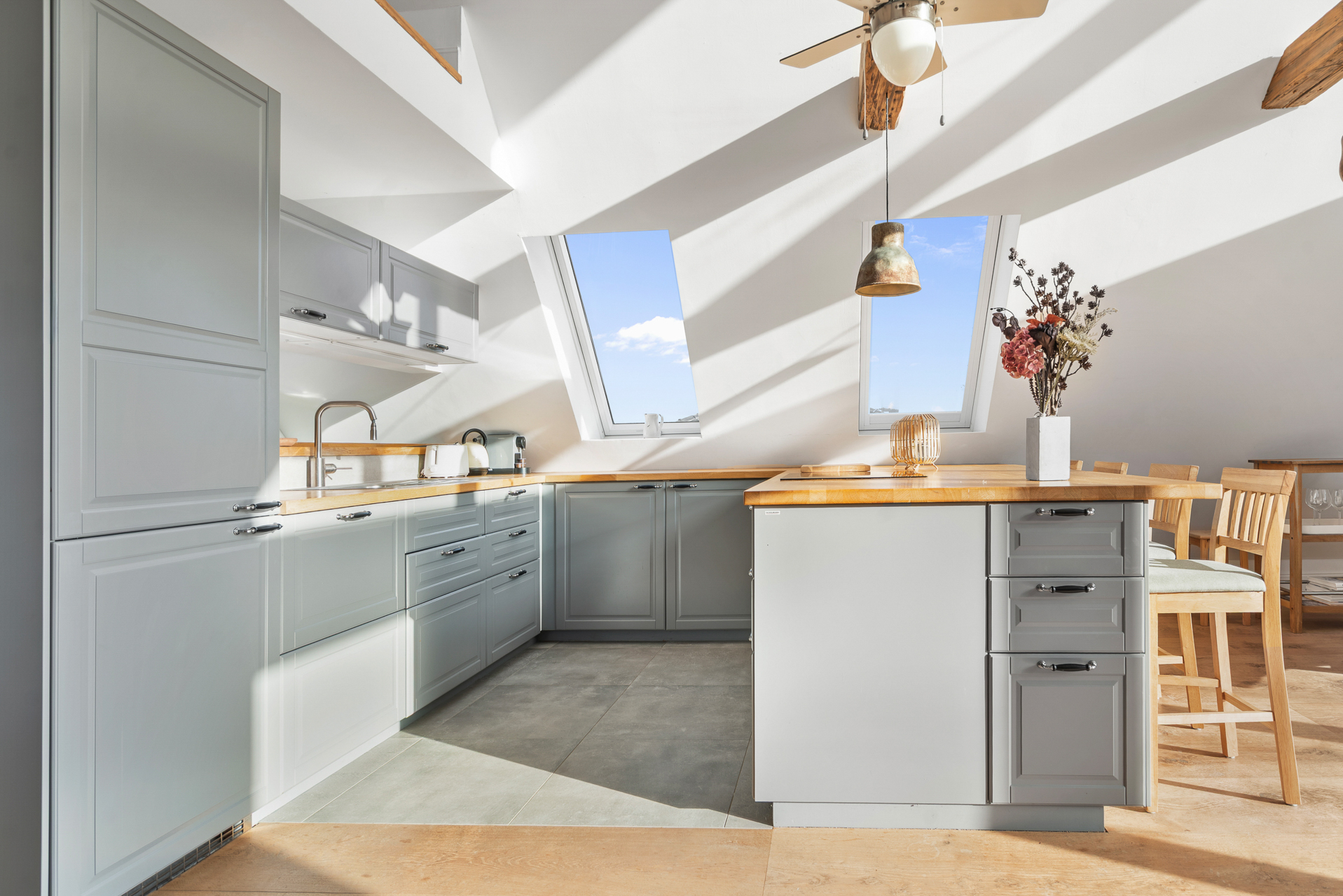 Über einen separaten Zugang führt der Weg in das Dachgeschoss, das als vollwertige zweite Wohneinheit genutzt werden kann. Auch hier prägen das Eiche-Echtholzparkett und die hochwertigen Holz-Alu-Fenster das wohnliche Gesamtbild und schaffen eine warme, stimmige Atmosphäre. Der großzügige Wohn- und Kochbereich erhält durch mehrere Dachfenster ein leichtes, offenes Raumgefühl, während sichtbare Holzbalken dem Bereich eine charaktervolle, loftartige Note verleihen. Die Küche orientiert sich an skandinavischem Design: ruhige Grautöne, klare Formen und natürliche Holzarbeitsflächen erzeugen ein unaufdringlich elegantes, behagliches Ambiente. Die breite Fensterfront öffnet den Wohnbereich zur überdachten Dachterrasse mit schönem Blick ins umliegende Grün. Sie verbindet den Innenraum mit der Natur und schafft einen Ort des Morgenlichts, des Weitblicks und entspannter Momente im Freien.
