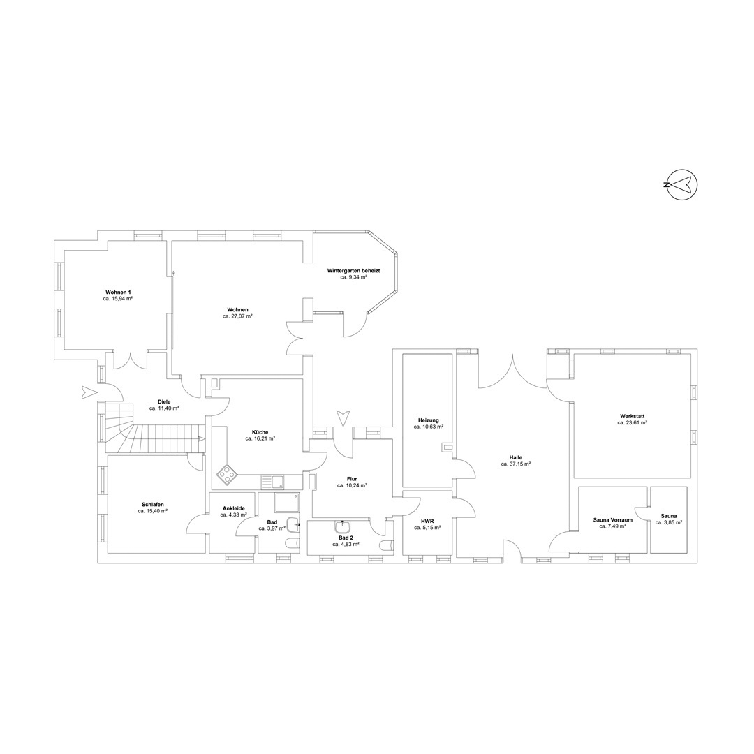 Im Inneren erwartet Sie ein großzügiger, funktionaler Wohnbereich mit insgesamt acht Zimmern, verteilt auf ca. 149 m² Wohnfläche und einer Gesamtfläche von rund 311 m². Über den einladenden Eingangsbereich gelangen Sie in ein helles Wohnzimmer mit Zugang zum beheizten Wintergarten. Diese Etage wird ergänzt durch ein weiteres Wohn- und Esszimmer, eine Küche, ein Schlafzimmer mit angrenzender Ankleide sowie ein Badezimmer. Über eine elegante, geschwungene Holztreppe gelangen Sie ins Obergeschoss, wo Sie ein großzügiges Elternschlafzimmer, zwei weitere Schlafzimmer, ein Badezimmer sowie ein weitläufiger Flurbereich erwarten, der sich ideal auch als Galerie oder Arbeitsbereich nutzen lässt. Das angeschlossene Nebengebäude ist direkt mit dem Haus verbunden und bietet mit Hauswirtschaftsbereich, Werkstatt, Garage sowie einer Sauna mit Tauchbecken vielfältige Nutzungsmöglichkeiten - sei es für Handwerk, Erholung oder zusätzlichen Platz im Alltag. Zwei Solarpaneele auf dem Dach unterstützen die Warmwasserbereitung nachhaltig.
